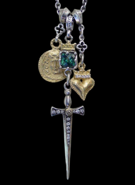 Gold & Silver Triple Charm Necklace & Green Tourmaline