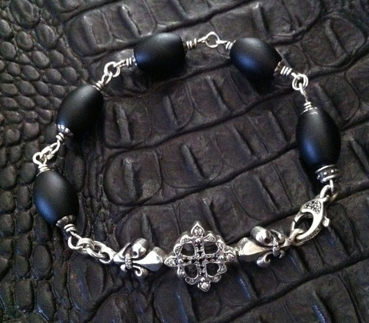 Sterling Silver Cross Fleur De Lis Bar Bacelet Diamond Pave with Oval Onyx beads
