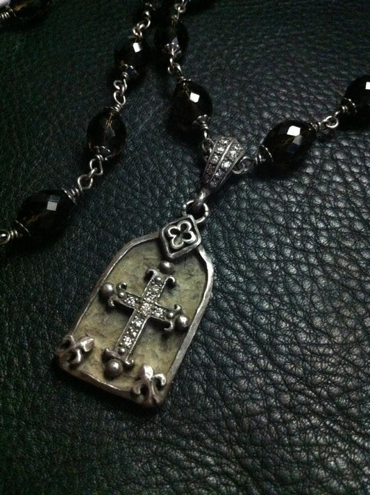 Sterling Silver Cross In Frame with Diamonds & Somky Topaz Beads