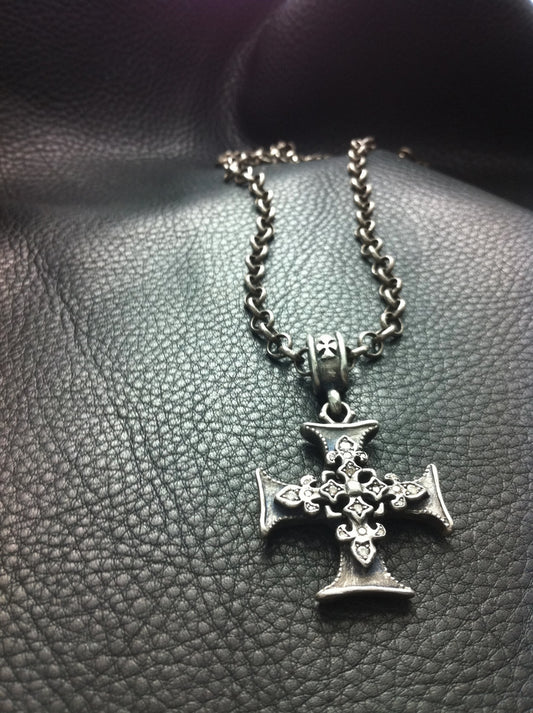 Sterling Silver Renaissance Fleur De Lis Cross with Diamond & Ruby Pave Necklace