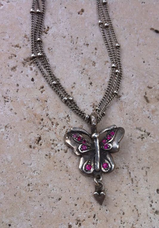 Sterling Silver Triple Chain Butterfly Necklace with Ruby Pave & Heart Drop