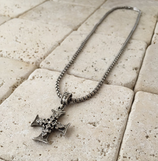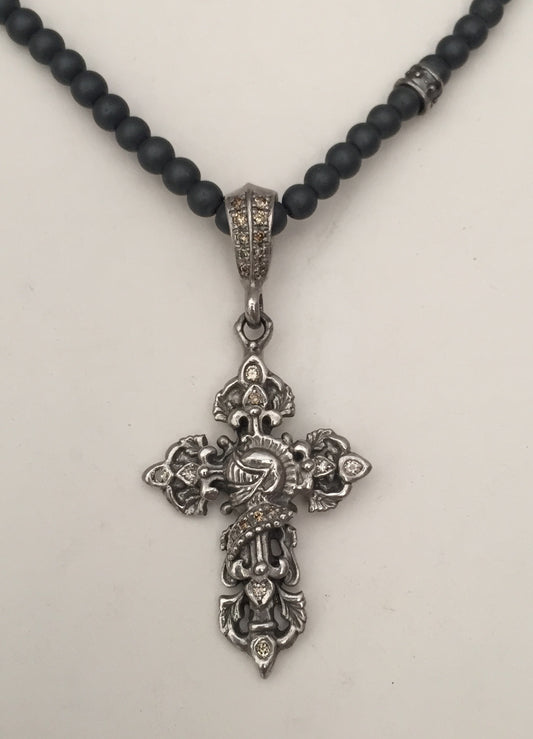 Sterling Silver Diamond Cross with Diamond Crown and Black Onyx Beads