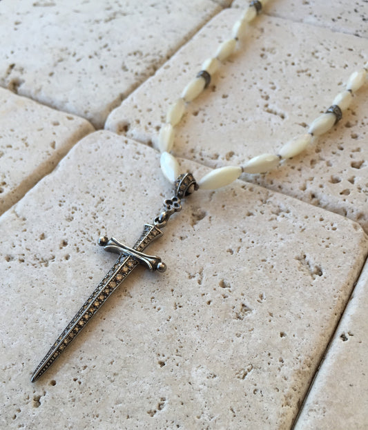 Sterling Silver Sword with Diamonds & Mother of Pearl Beads