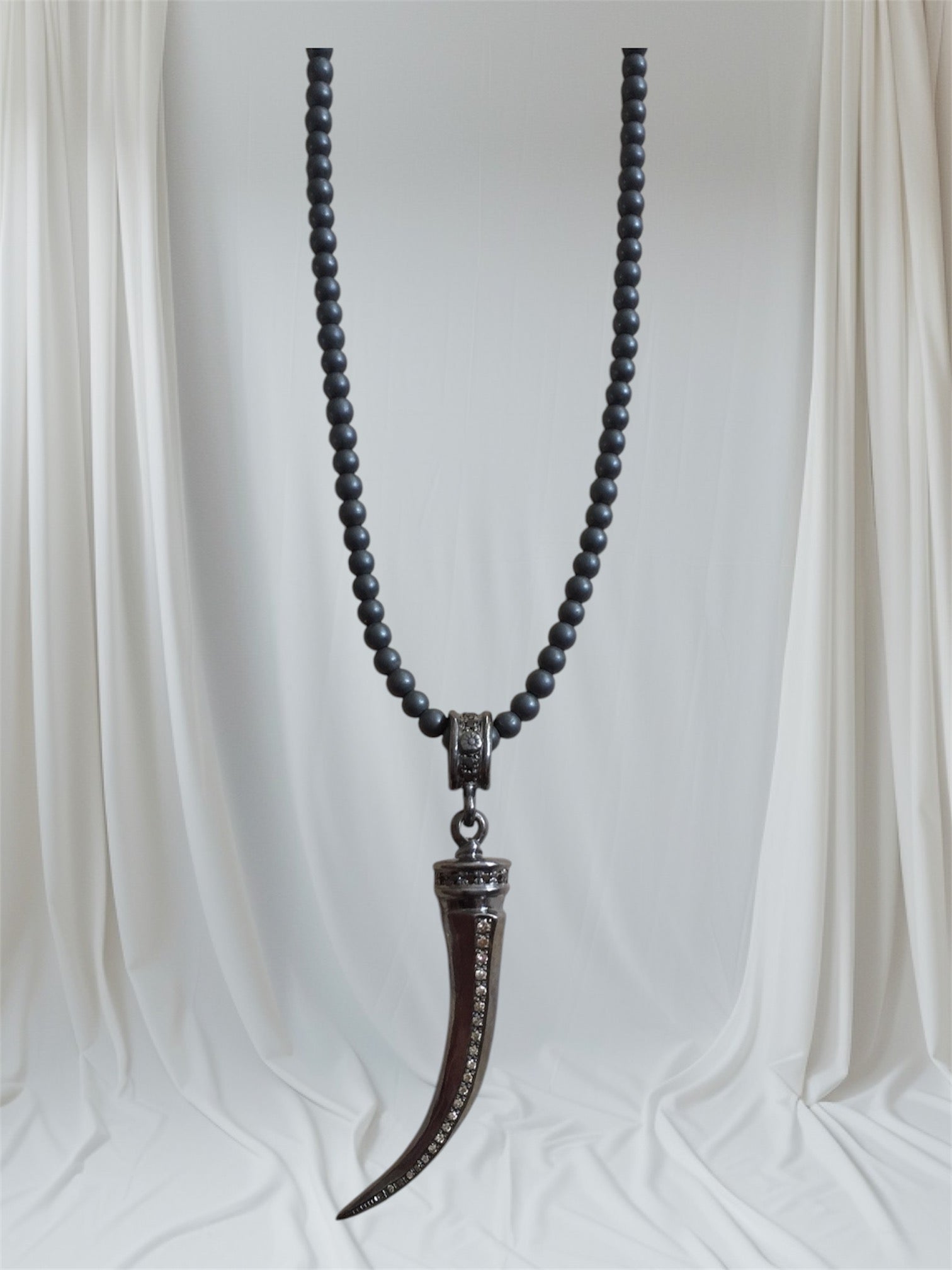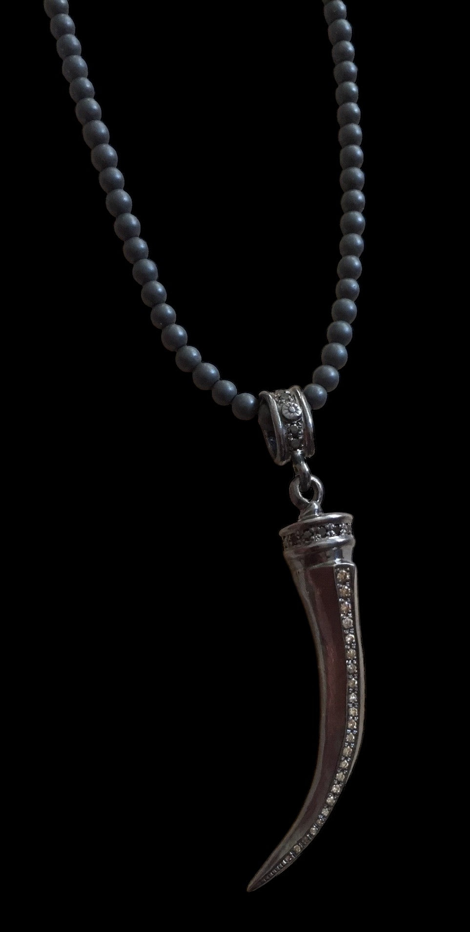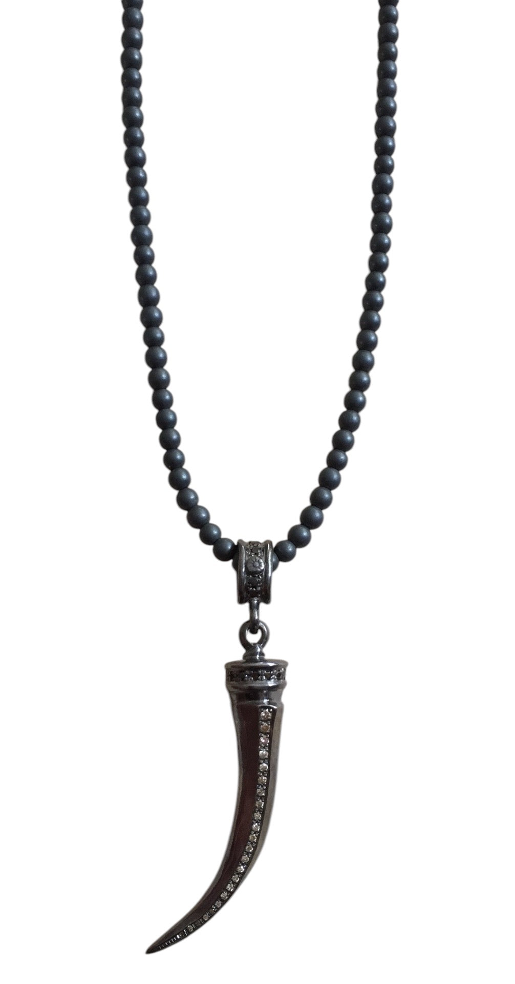 41% off Discount code: 1C7TTP7MR8Q7 Sterling silver Italian amulet horn with champagne diamonds and black diamonds. Hematite beaded 22-inch long chain with silver lobster clasp.