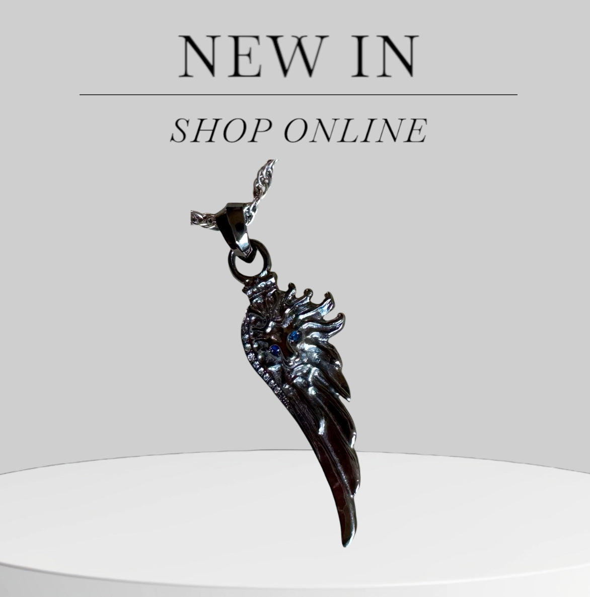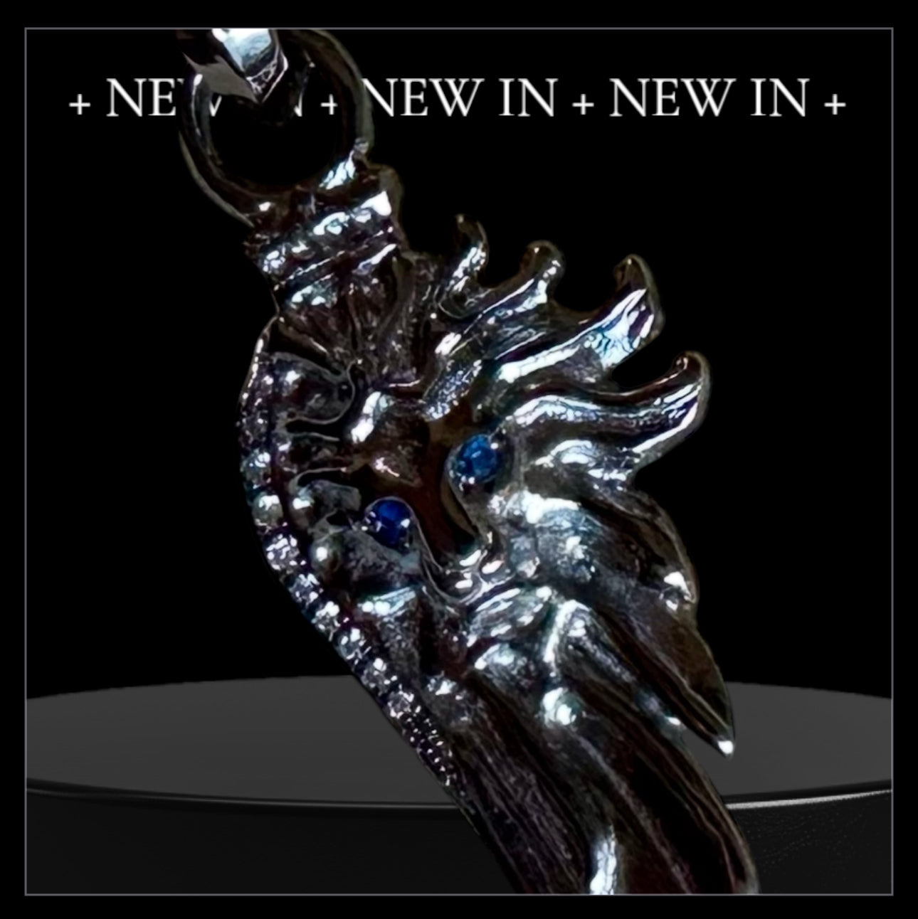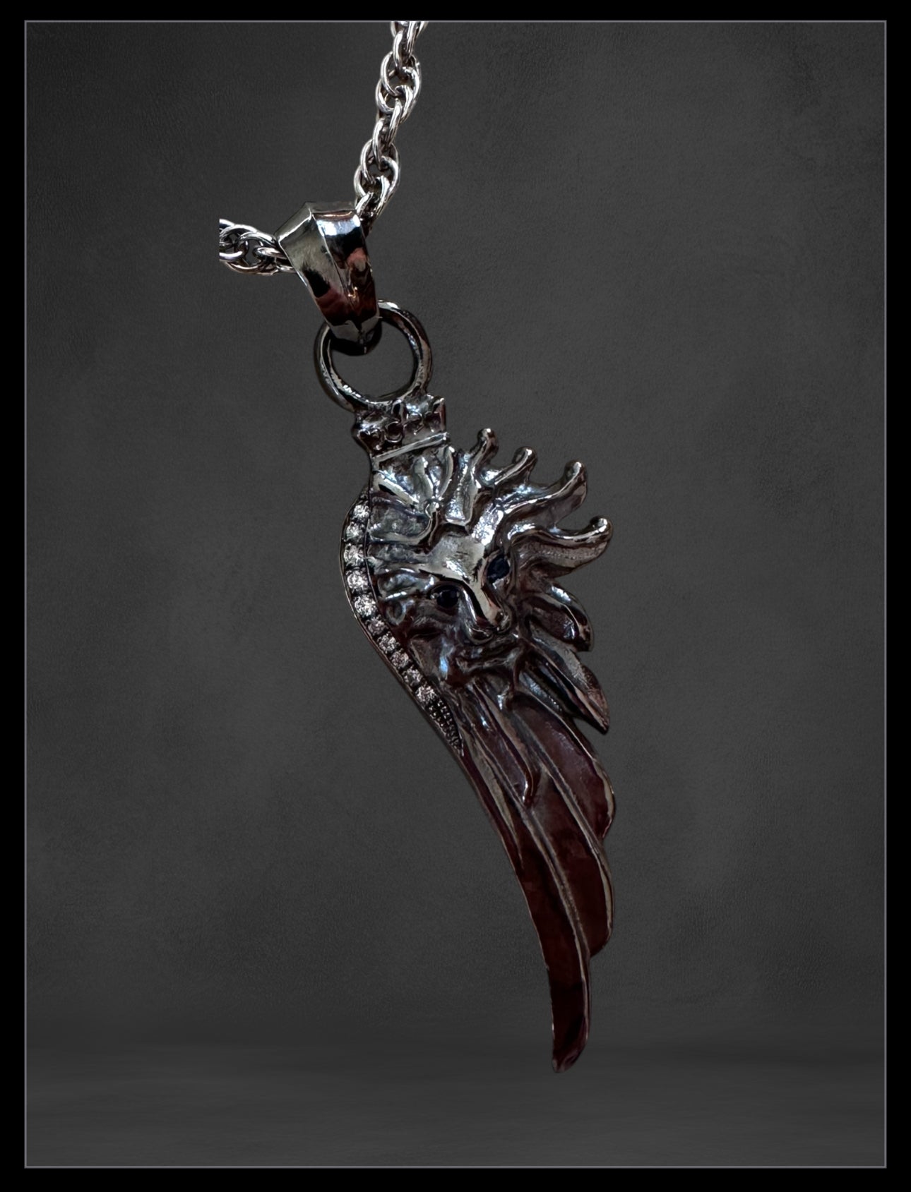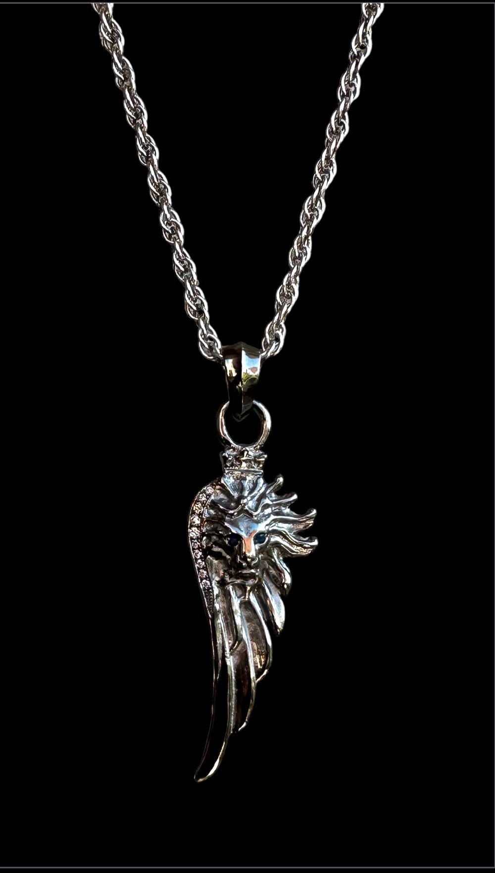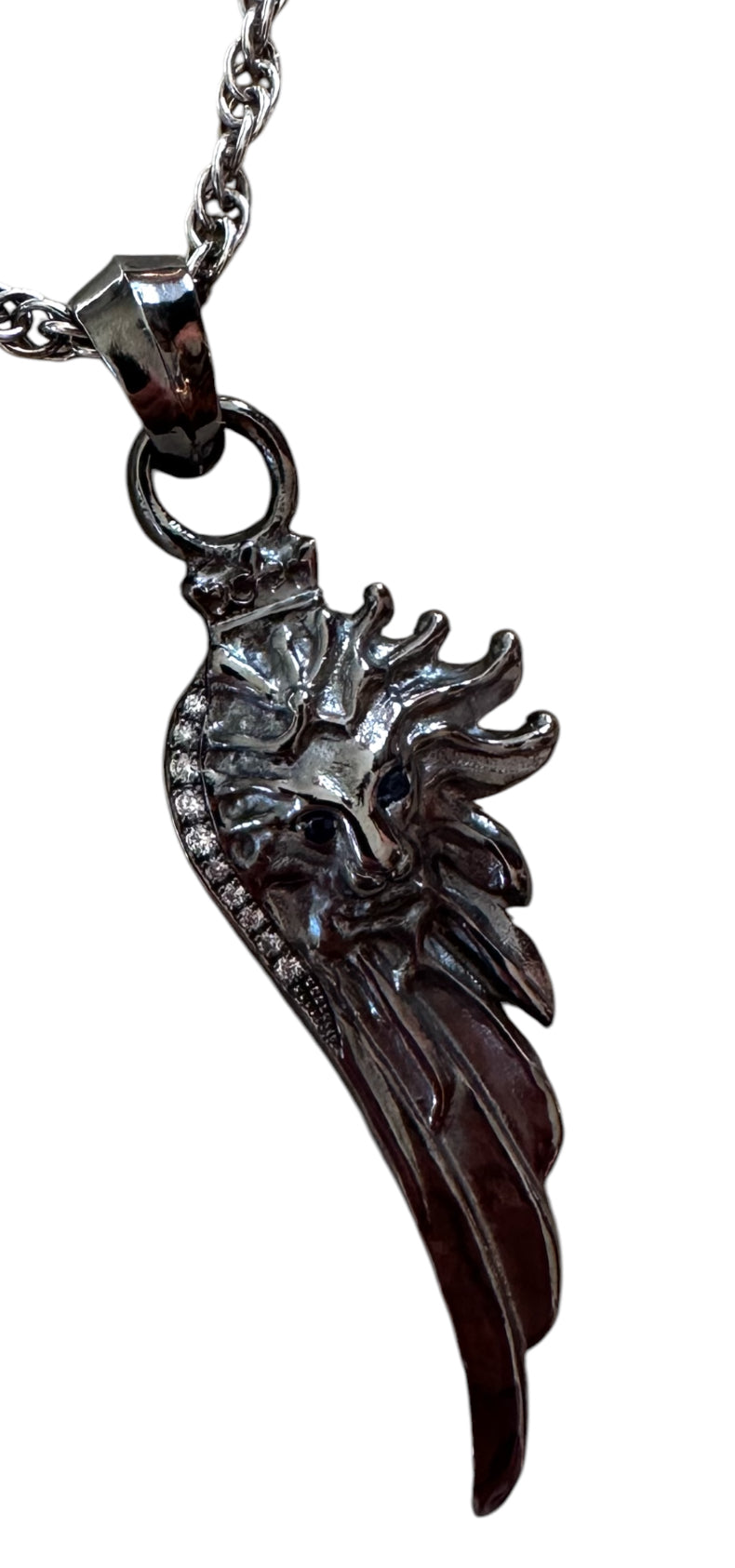 Sterling silver lion wing plated with black platinum set with white diamonds pave and sapphire eyes. Sterling silver woven chain plated with white platinum. Lobster clasp.