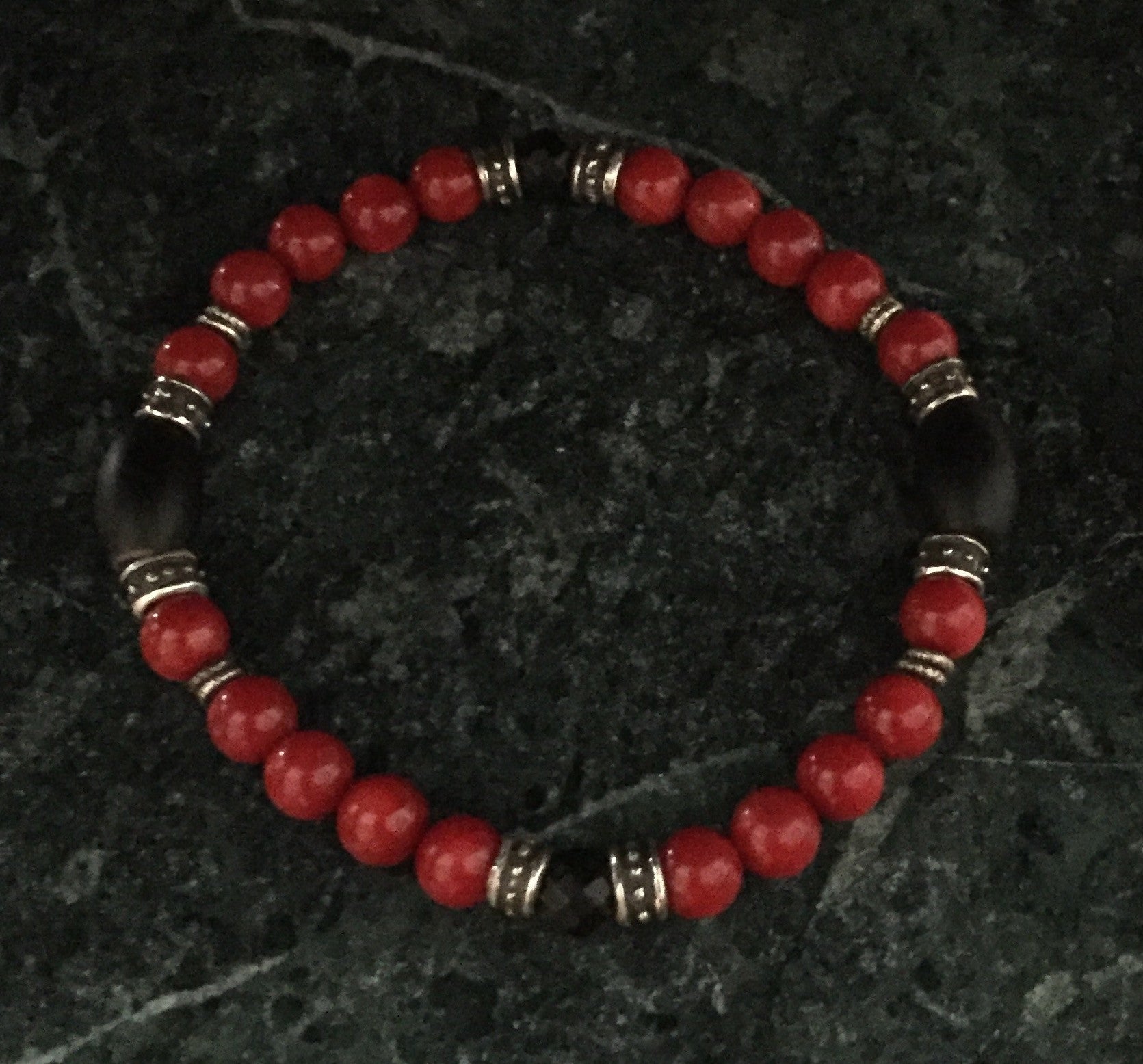 Bracelet - Red Coral & Onyx with Silver Roundels