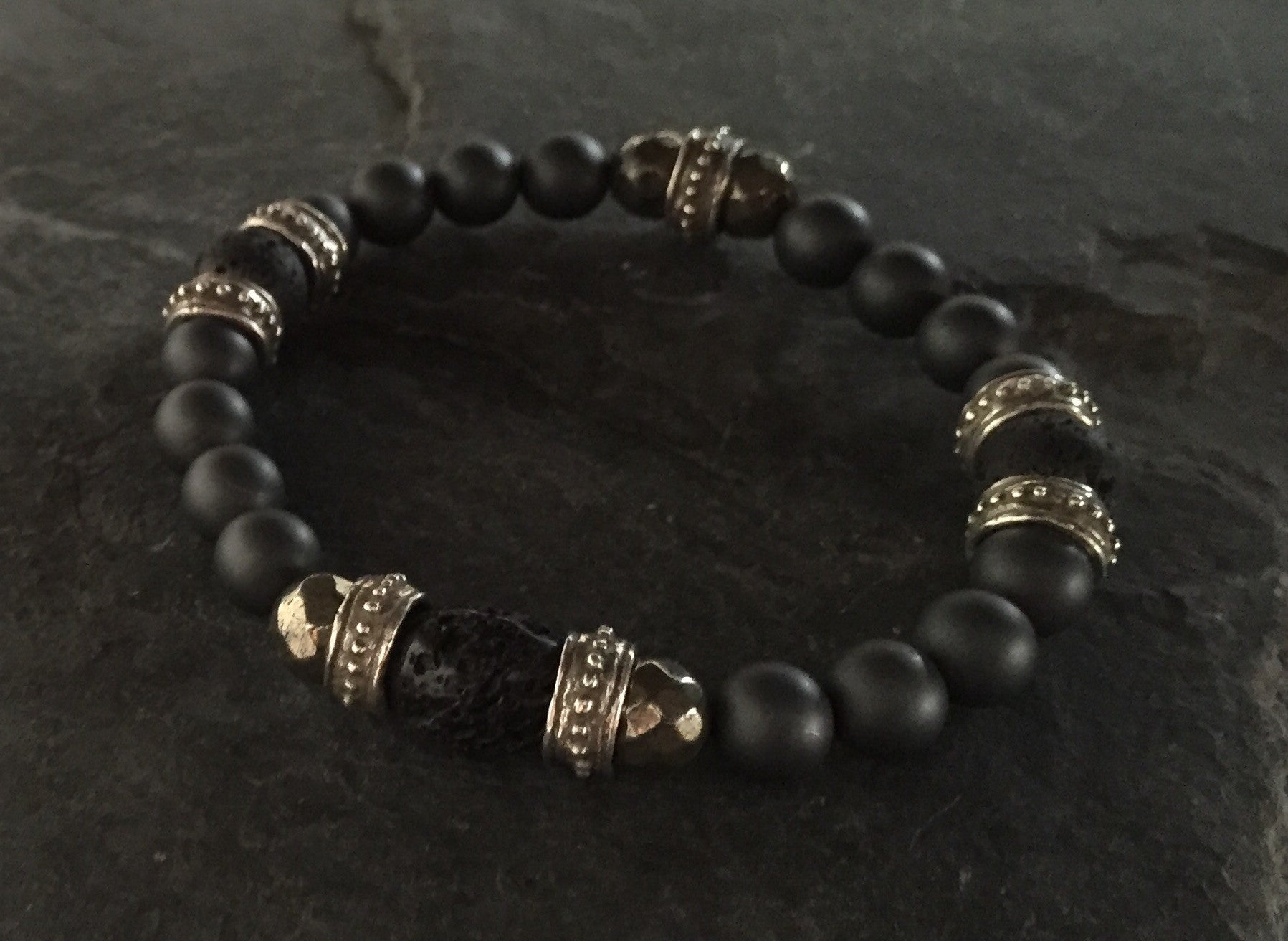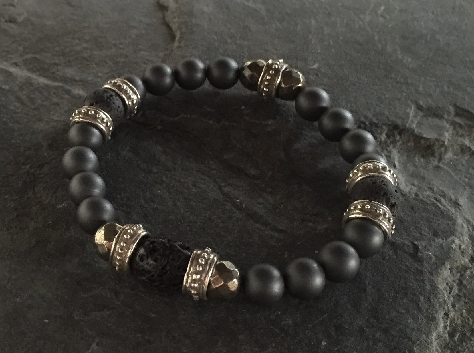 Stretcher bracelet. Sterling silver roundels. Oval black lava bead center. Satin 10mm round hematite beads and black onyx faceted 10mm beads.
