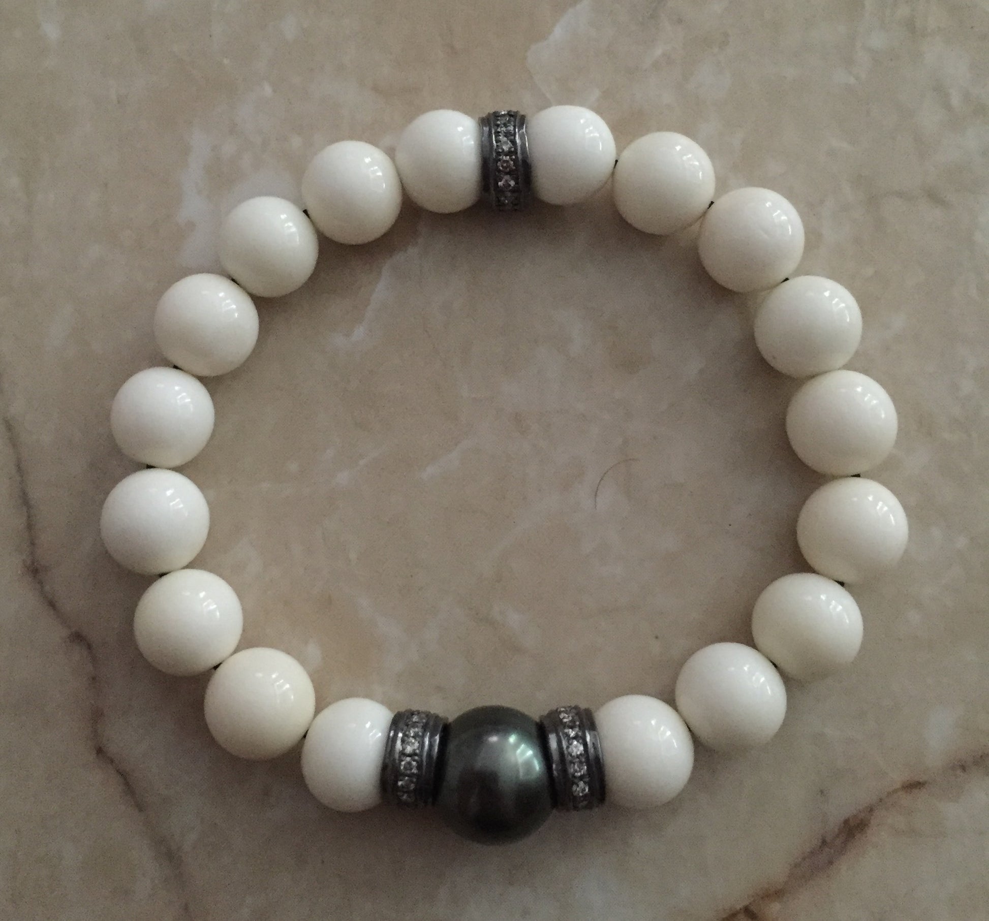 41% off Discount code: 1C7TTP7MR8Q7 tahitian black pearl 12.5mm with sterling silver roundels set with champagne diamonds. White coral 10mm beads. Stretcher bracelet. B 1322ss/dia (0740)