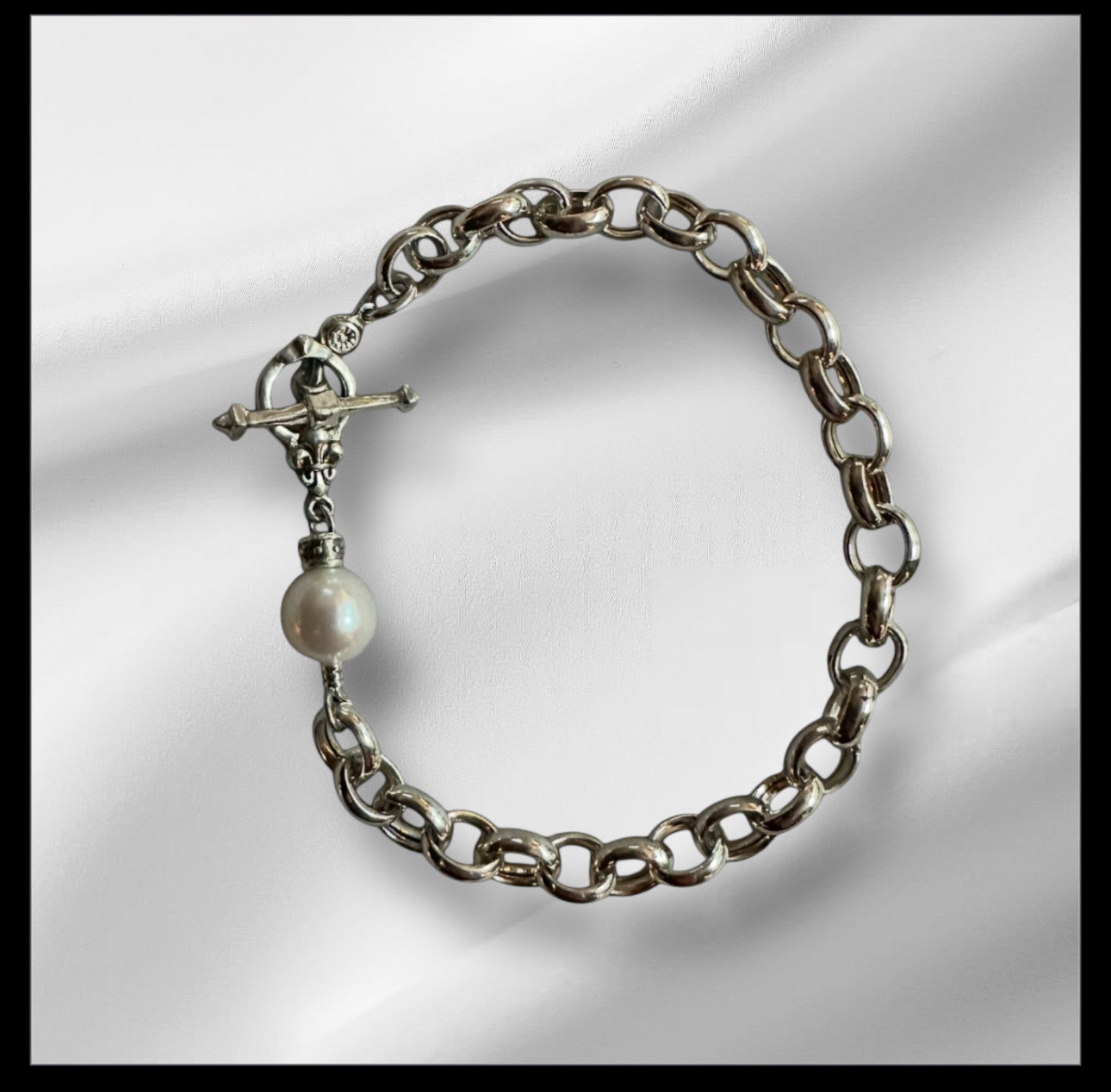 sterling silver hollow link chain with white pearl and Fleur de lis toggle and T bar closure.