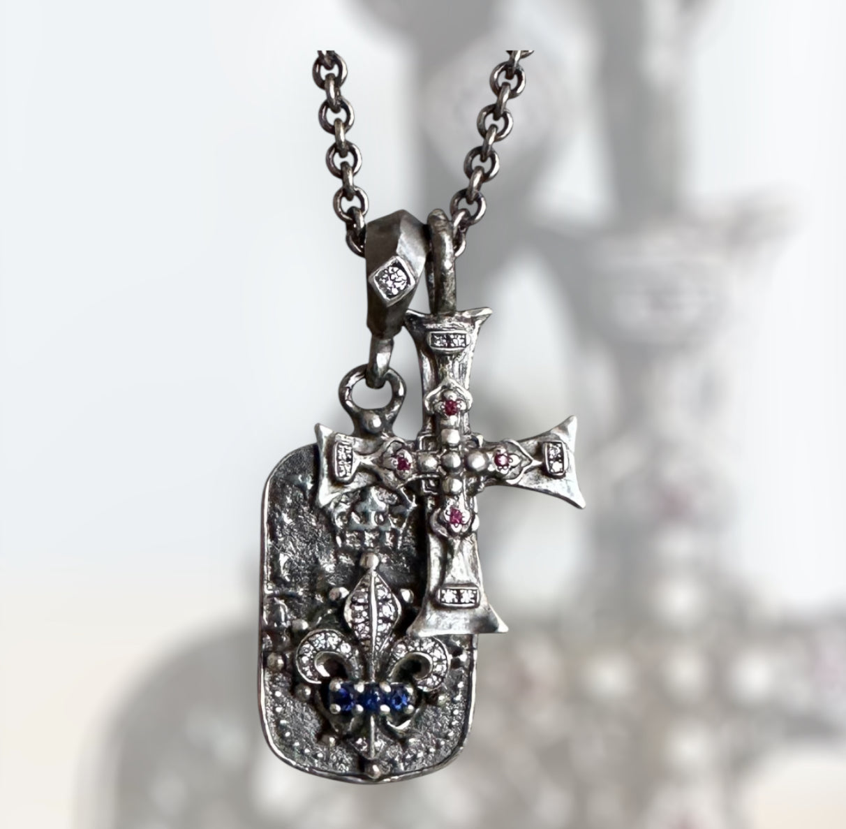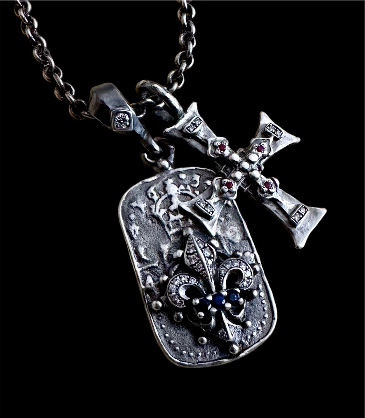 Roman Paul Jewelry promotional 51% off code: 7DFJWNHSTRD2 Sterling silver necklace with white diamonds pave and blue sapphires and rubies. All plated with black platinum.