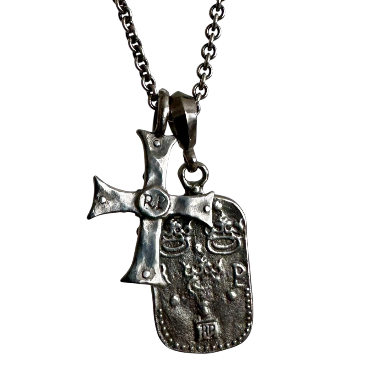 chain is 22” inches long. Shield Measure approximately 2 inches long with bail and three-quarter inch Wide. All is in renaissance style looking like museum art jewelry, like old world historical treasure.