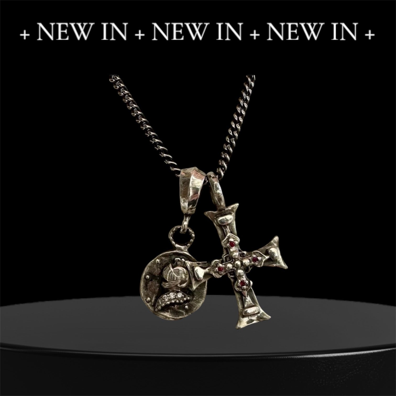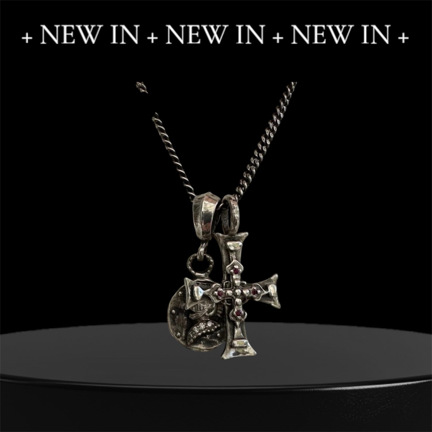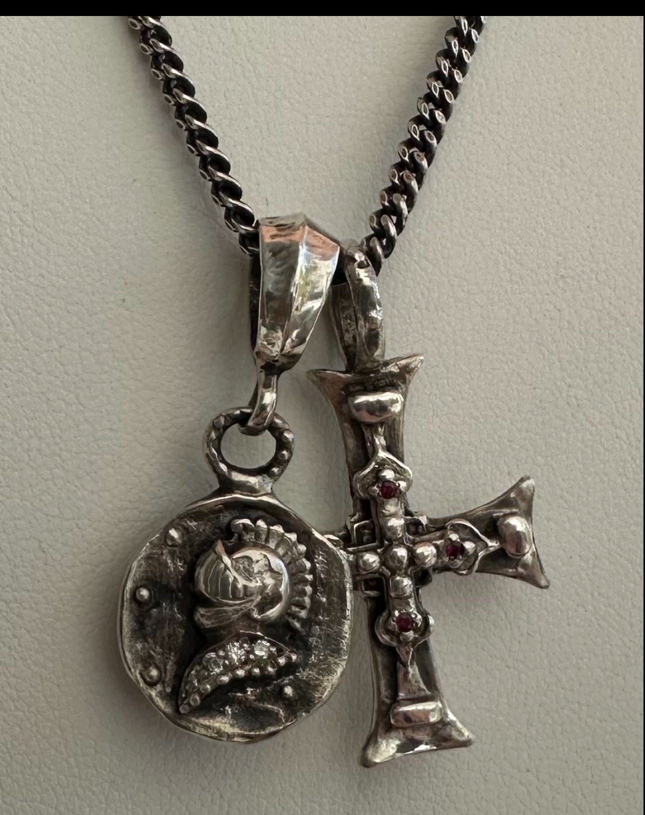 Sterling silver double charm necklace cross and knight medalion. Cross set with 4 red rubies. Knight medallion set with Champagne diamonds. Cross measures 1-1/4 inch toll and 1 inch wide. Medalion is 3/4 of an inch in diameter.