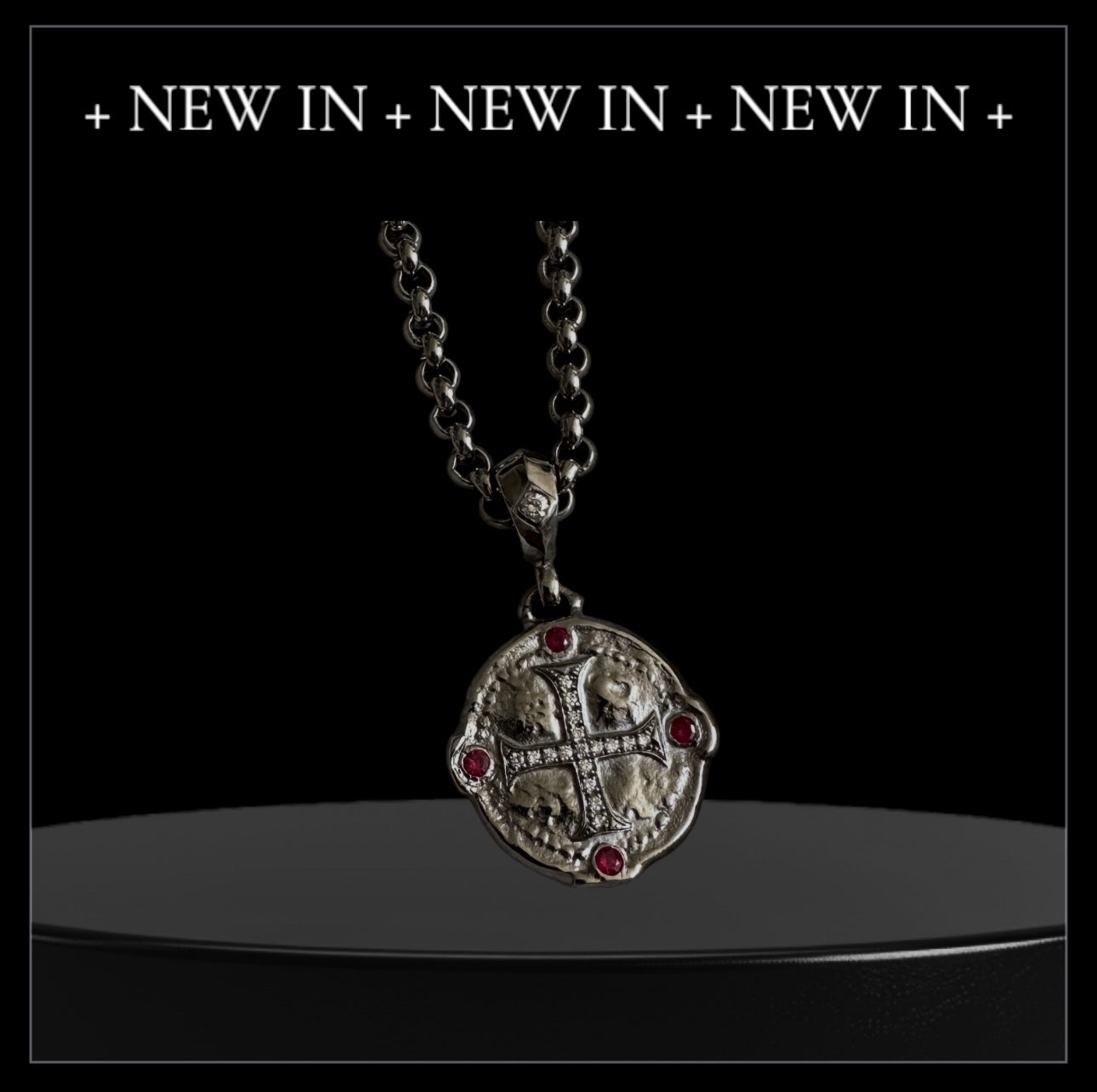 Sterling silver cross medalion set with white diamonds pave and 4 rubles all plated with black platinum (rhodium). Medalion measures approximately 1” inch in diameter and chain is 22” inches long (standard men size). Lobster clasp closure.