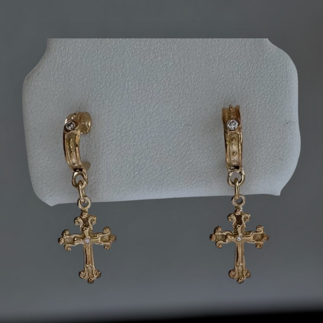 18k yellow gold plated sterling silver cross on hoop earrings set with white diamonds. Earrings measures 3/4 of an inch high and 1/4 of an inch wide.