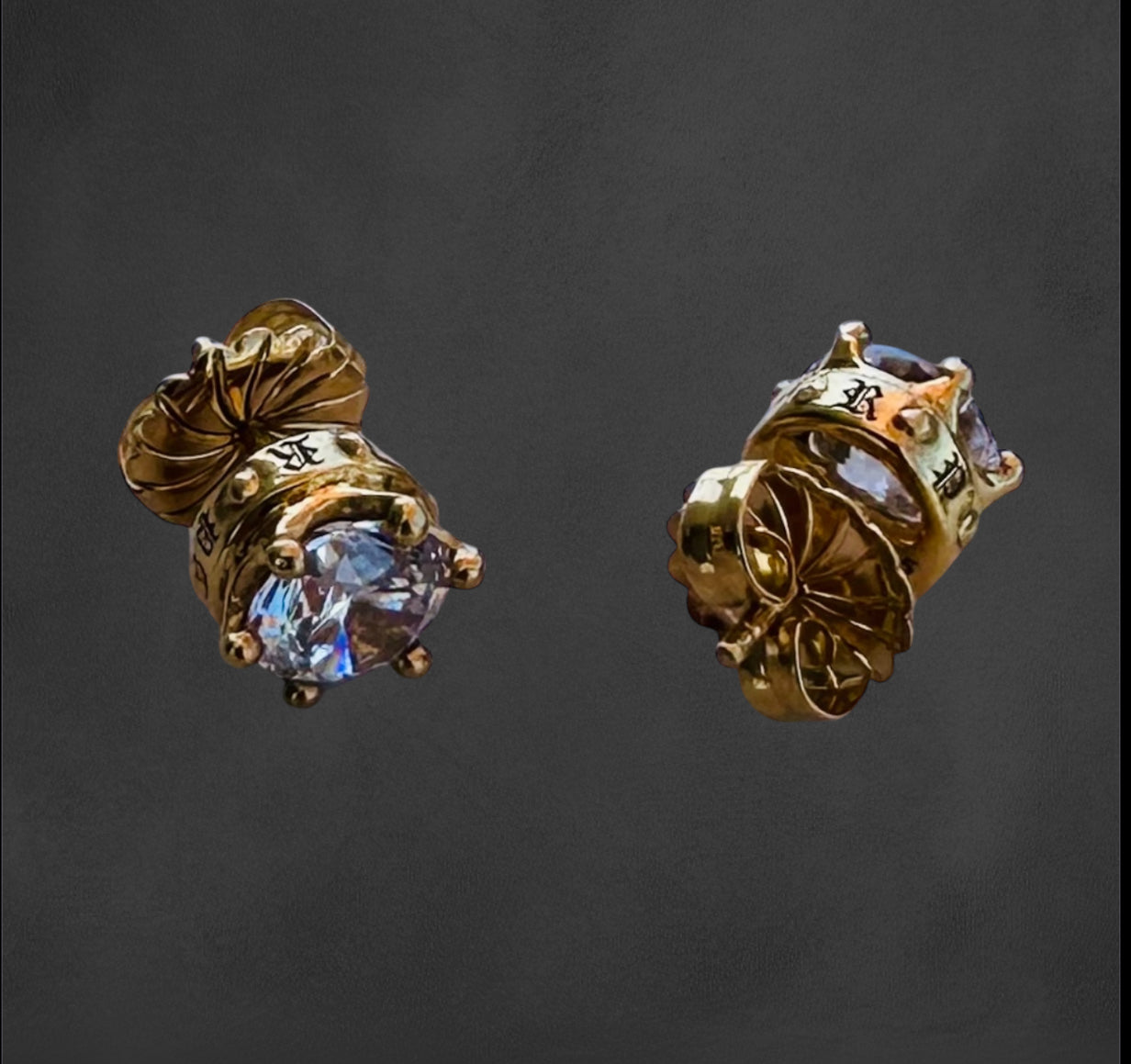 Sterling silver crown stud earrings with 8mm CZ. Renaissance style crowns. Plated with 18 karat yellow gold.