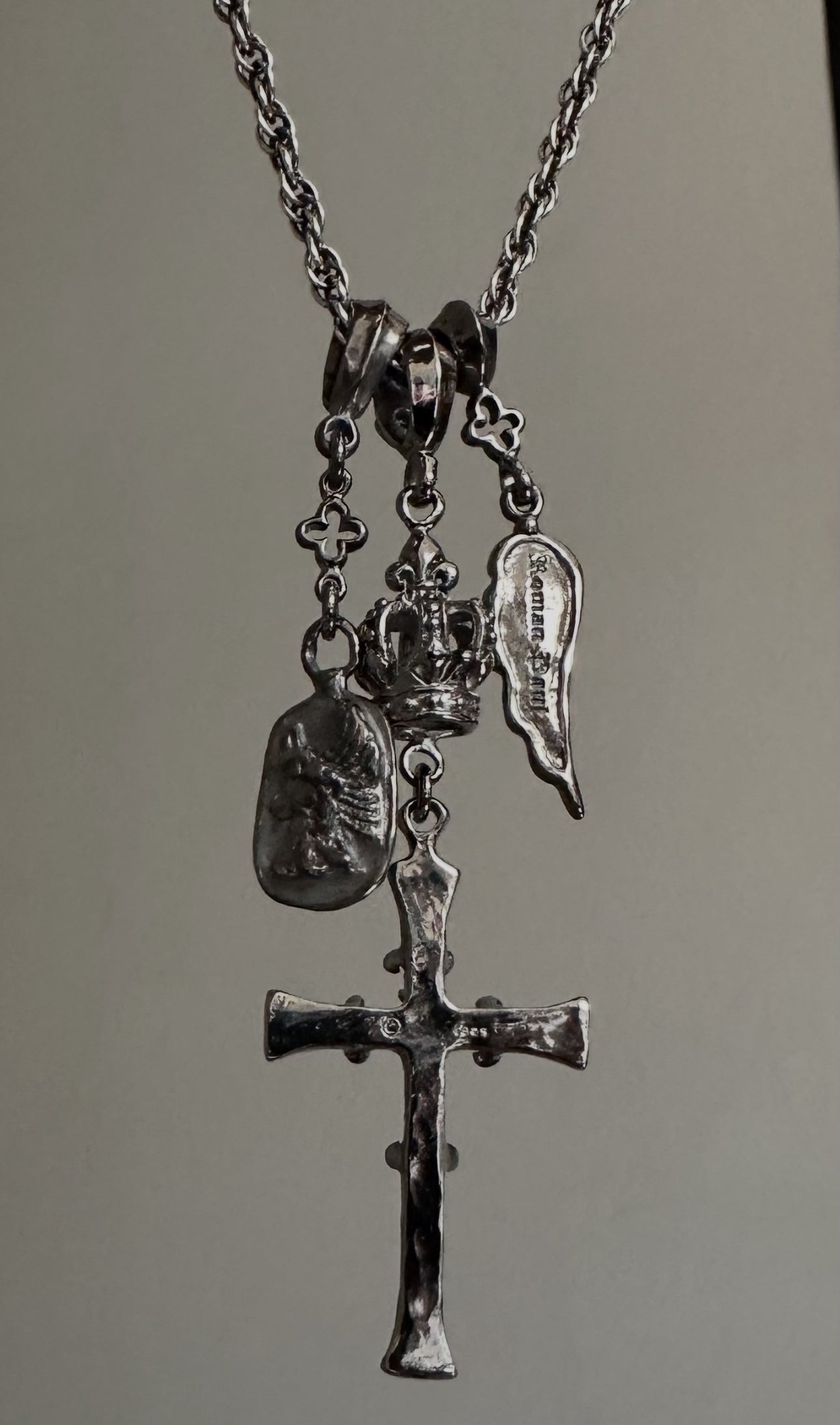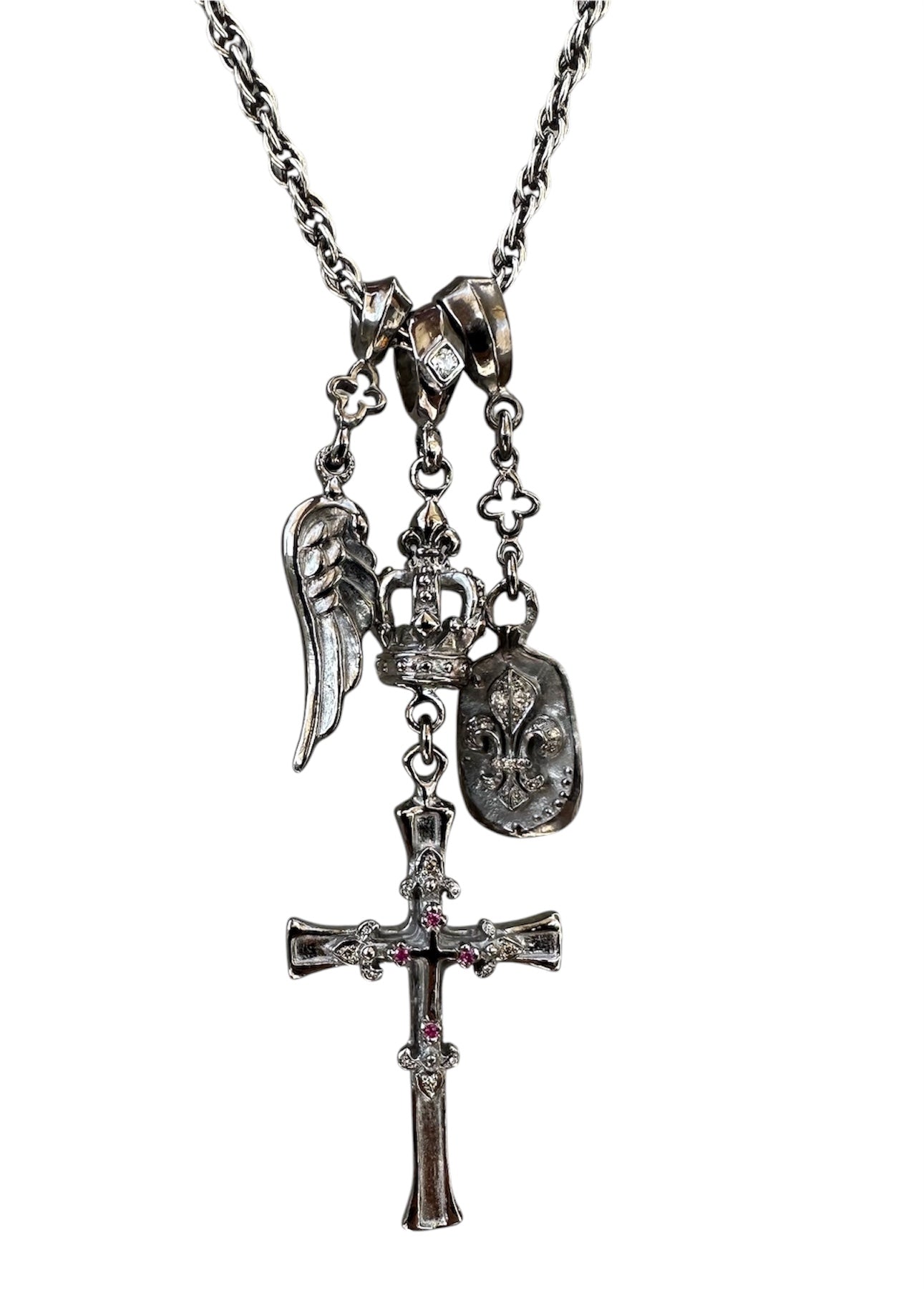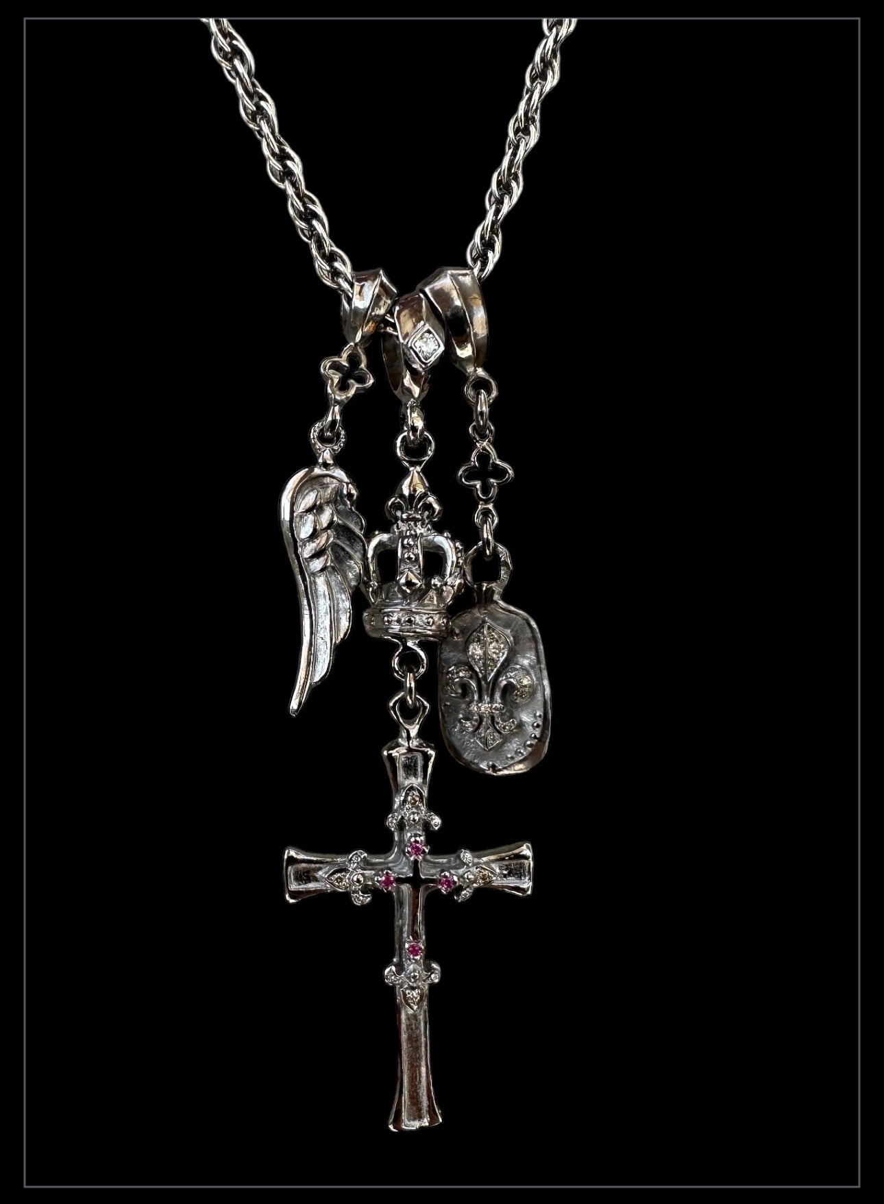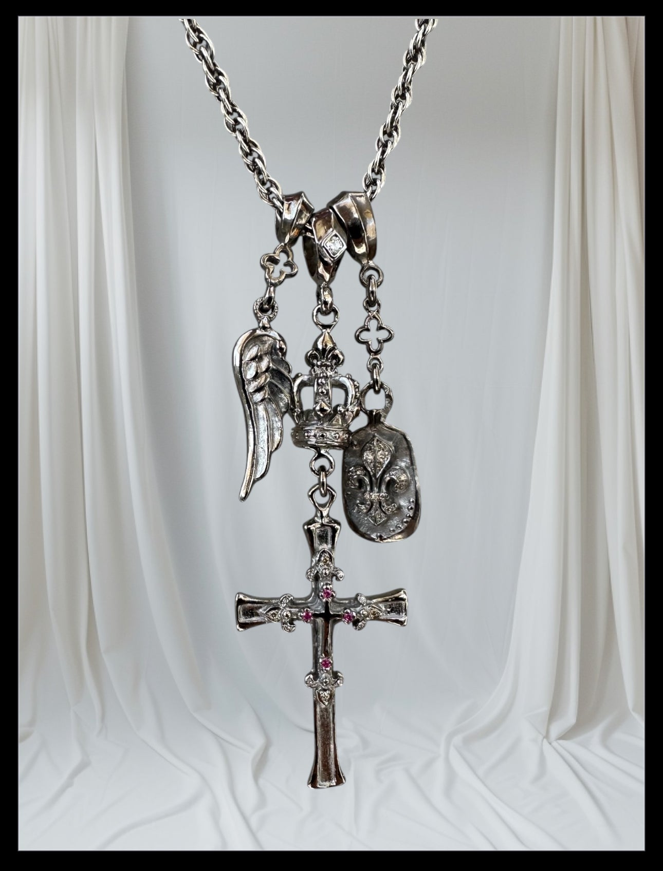 Sterling silver cross with rubies and diamonds, crown, Fleur de lis medallion with diamonds and the wing. Silver bail set with diamond. Cross measures approximately 2 inches long and 1 inch wide.