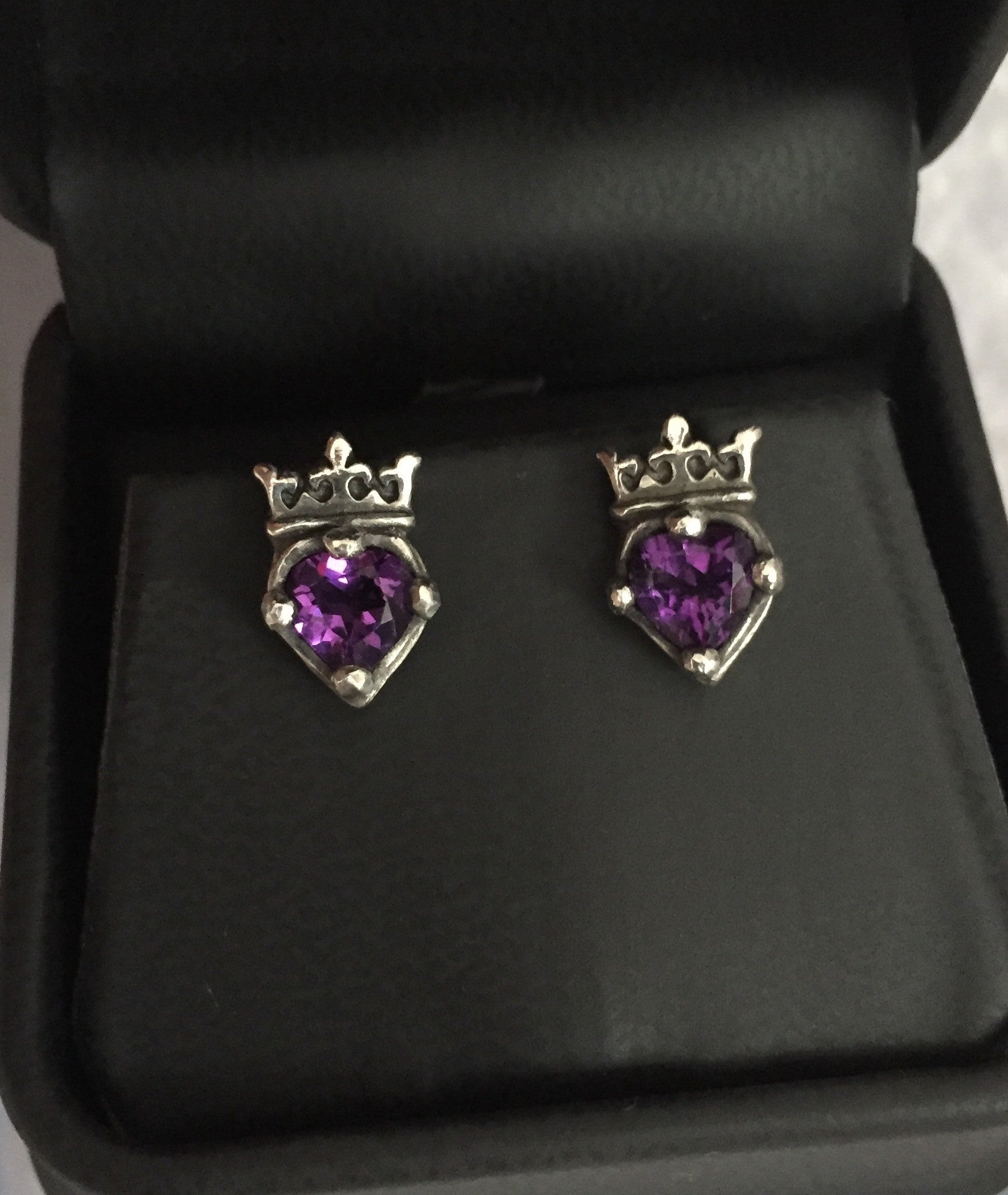 Sterling silver crowned hearts with amethyst. Post earrings.