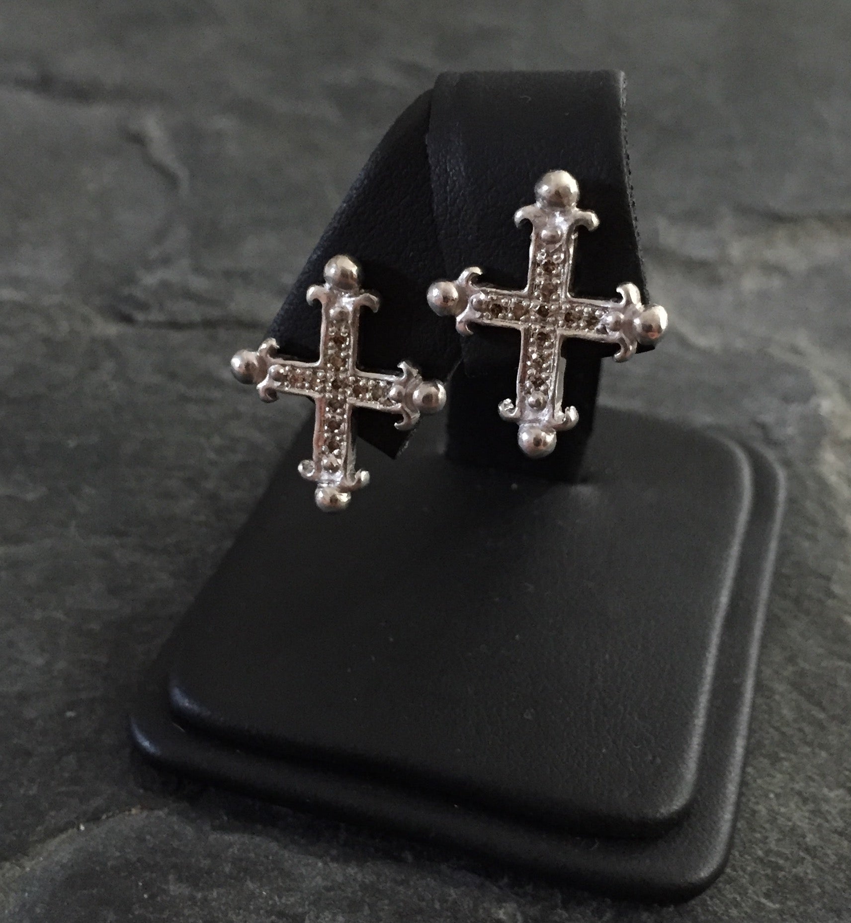 Platinum over sterling silver earrings, gothic cross and champagne diamonds. 18k solid gold posts and ear nuts.