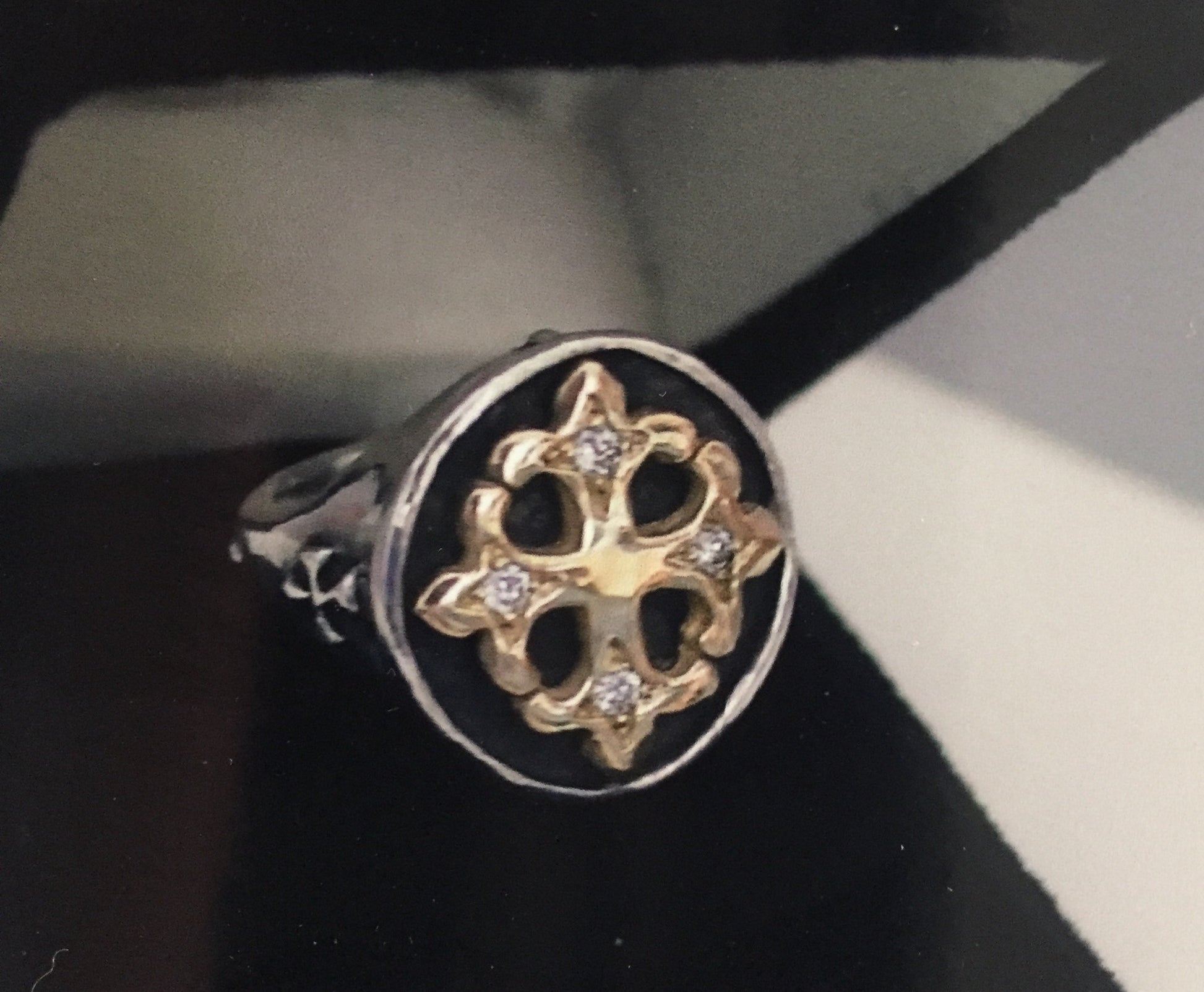 Yellow gold 18k fleur de lis cross with white diamonds - sterling silver ring.