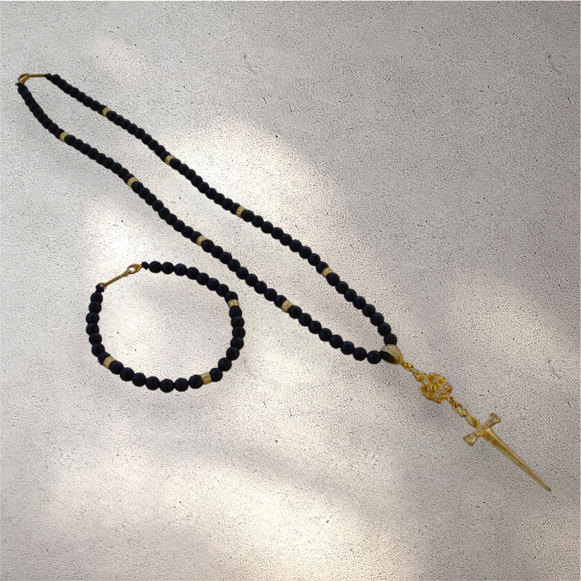 Yellow gold 18k sword with crown set with white diamonds. Faceted black onyx beads. 18k gold roundels. Necklace is 22'' inch long + extension 8'' inch long bracelet. Sword,crown and bail is 3.5" inch long. N 1005-1051 18k/dia.