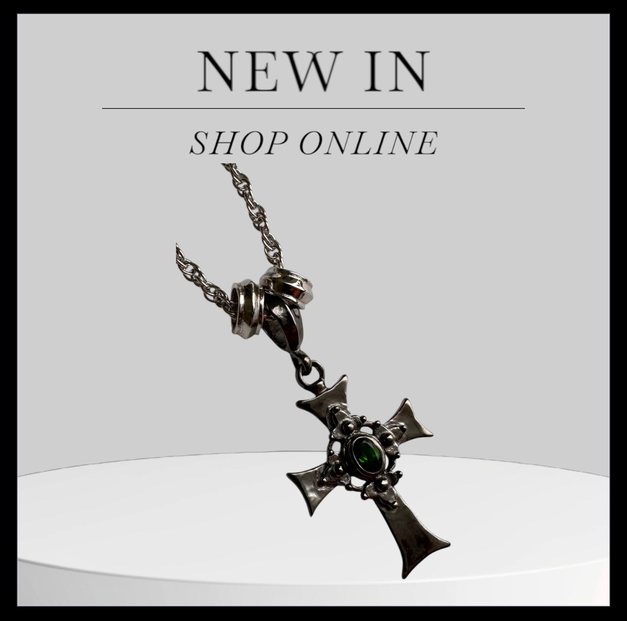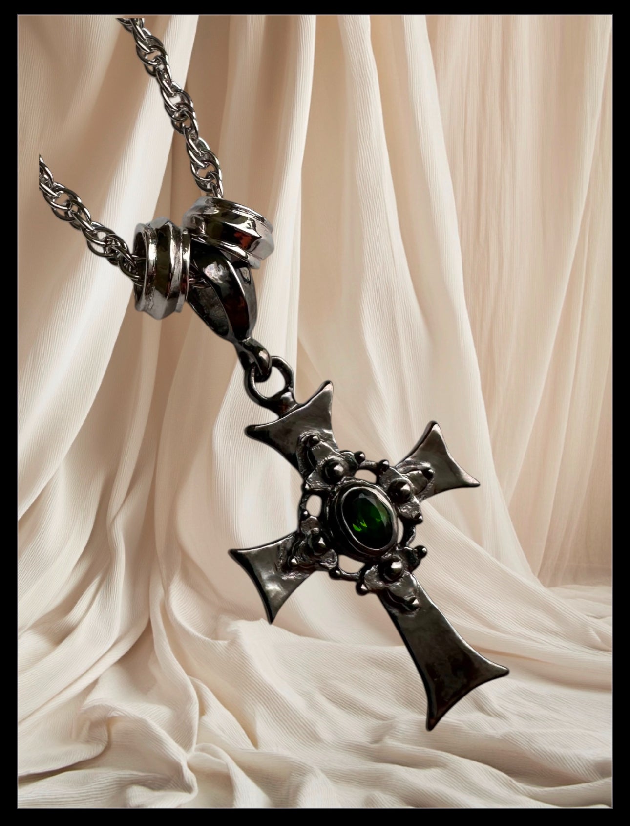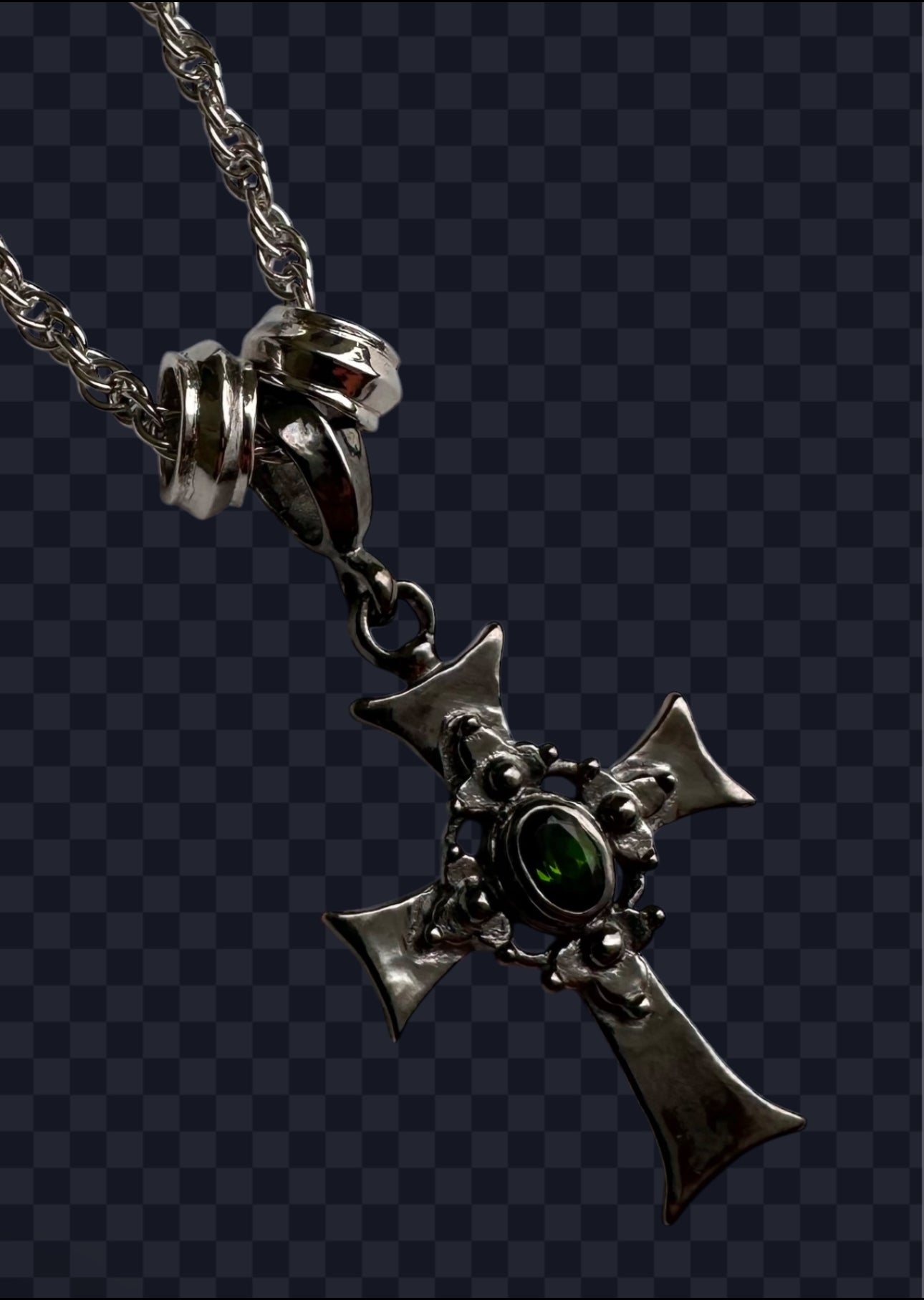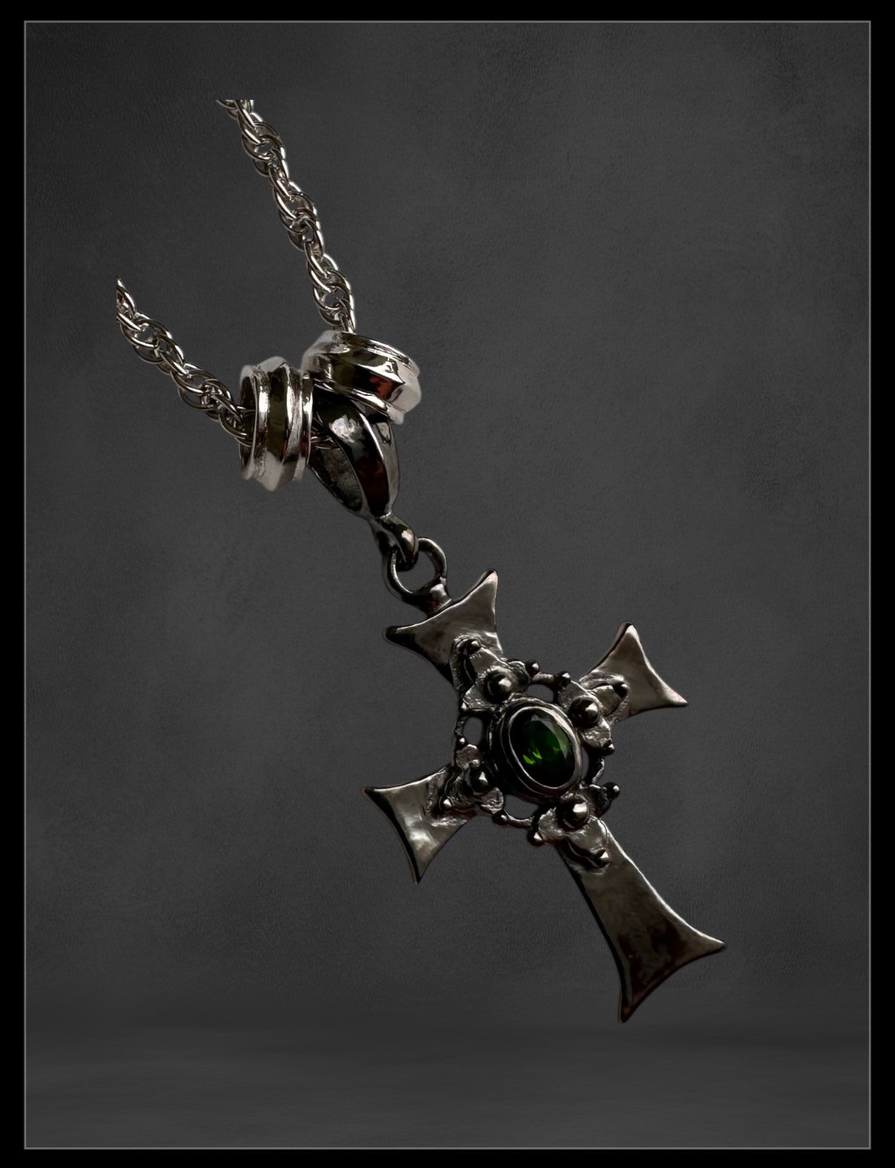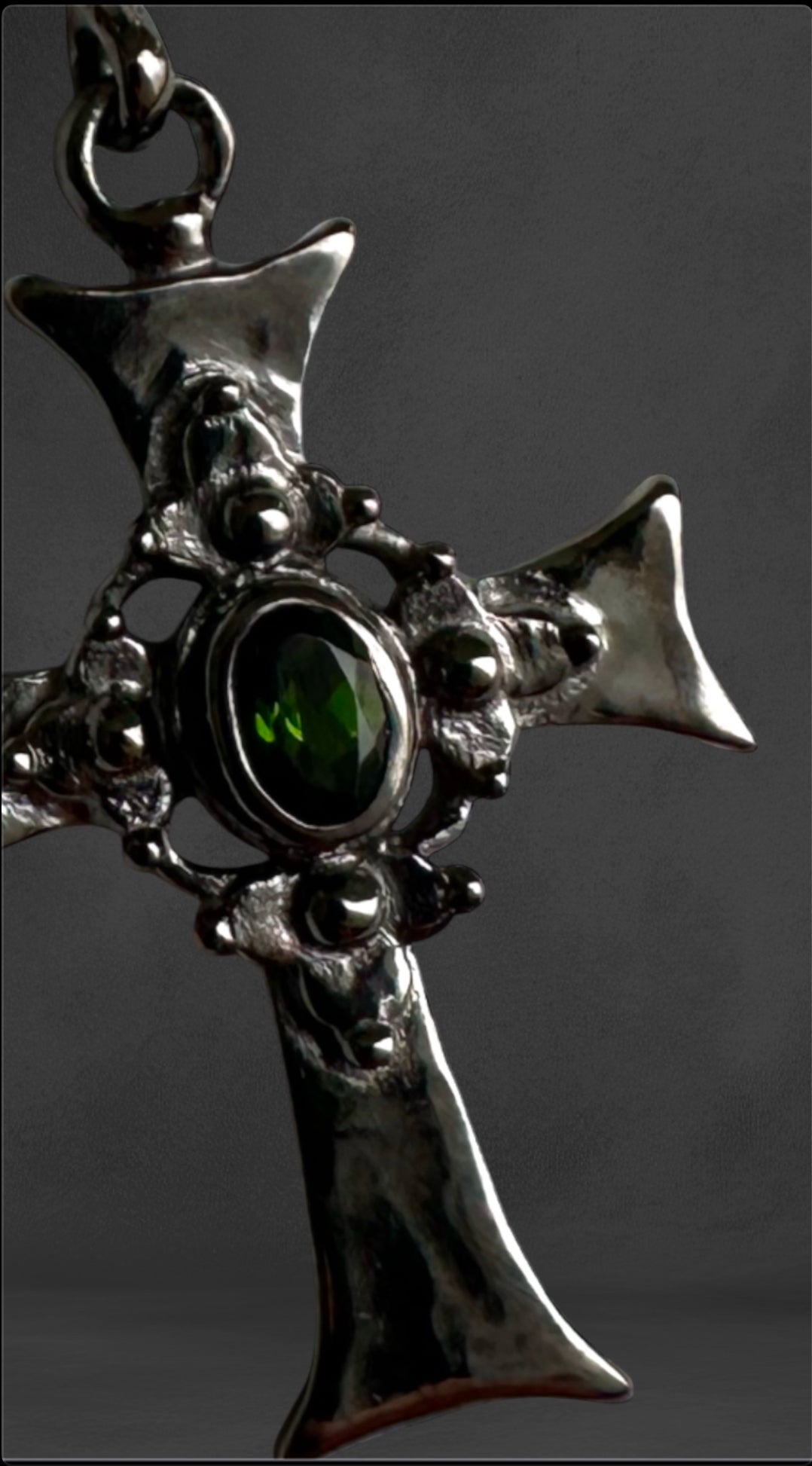 Roman Paul Jewelry promotional 51% off code: 7DFJWNHSTRD2 Sterling silver cross with ornament center set with dark green oval Turmaline. Cross measures approximately with bail 2” inches long and 1” inch wide. All plated with black platinum.