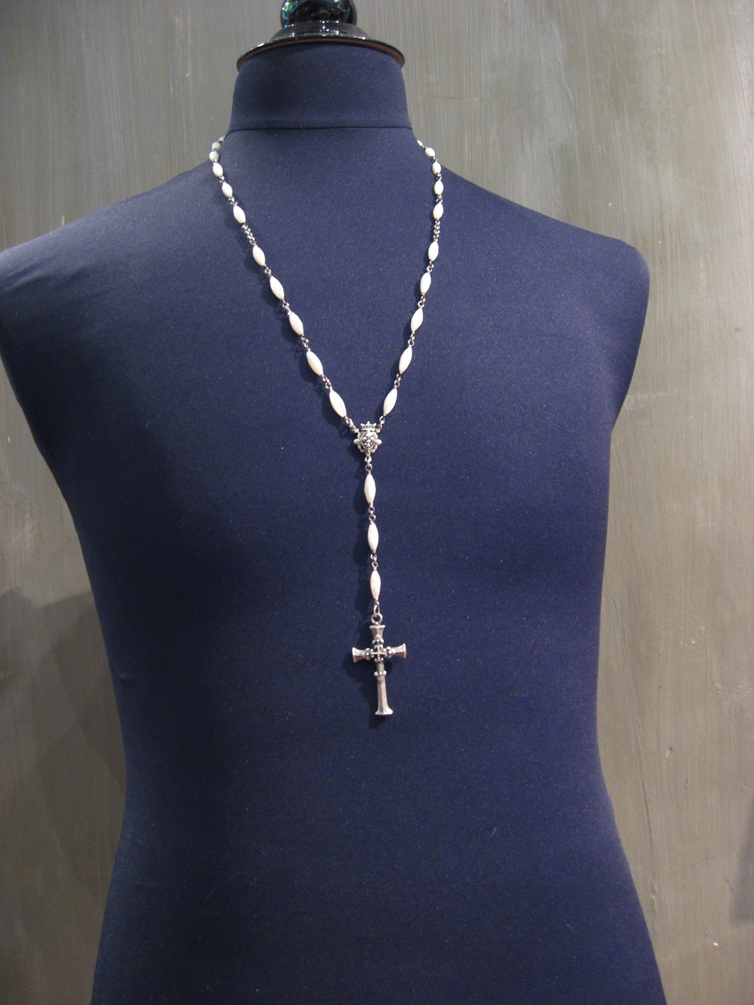 N 1119 Sterling silver rosary style cross necklace with mother of pearl faceted beads and fleur de lis centerpiece with crown. Cross measures approx. 1-3/4 of an inch long and 1 inch wide. Necklace is about 22.5" inch long around neck as shown on second photo, plus extension 7.5" inch long bracelet with necklace as shown on photo with book. All is 30" inch around neck.(0340)