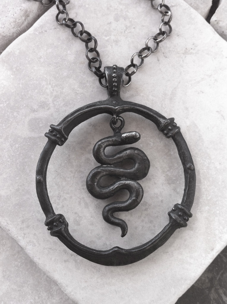 Sterling silver snake in circle dark oxidized hand hammered finish. Sterling silver chain is 30 inch long.Sterling Silver frame with bail is approx. 2.5 inch across. N 1211-1210 ss.
