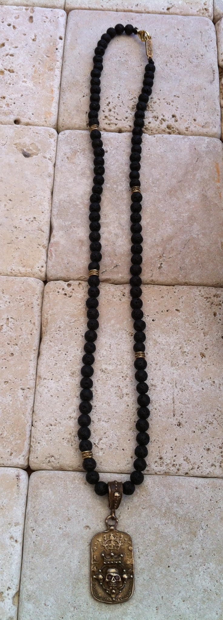 Bronze skull dog tag with garnet eyes and crown. 6mm round lava beads with bronze rondels. Bronze skull bail. Necklace is 24" inch long. Dog tag with bail is 2" inch long and 3/4" inch wide. This 24" inch long beaded chain without charm wrapped around your wrist makes very cool triple layer bracelet. N 955-984 BZ.