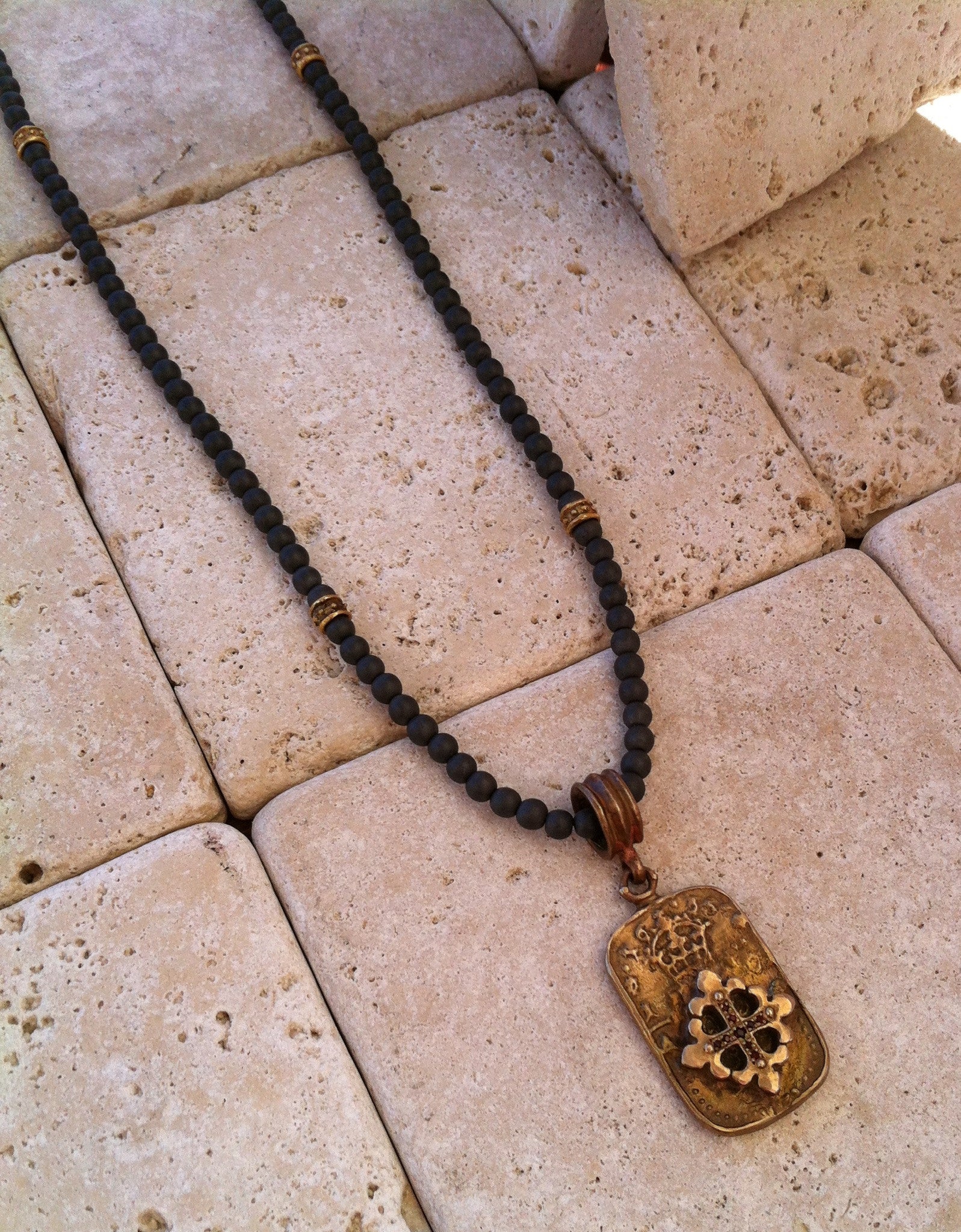 Necklace is 24" inch long and round 4mm black onyx beads with bronze rondels. Lobster clasp closure. This 24" inch long beaded chain wrapped around your wrist makes very cool triple layer bracelet. N 989 BZ