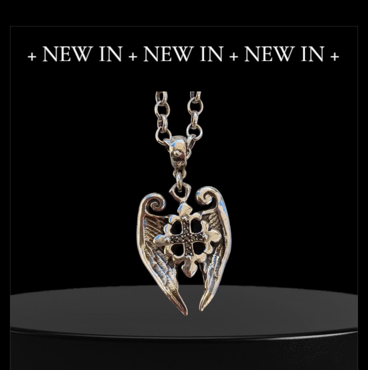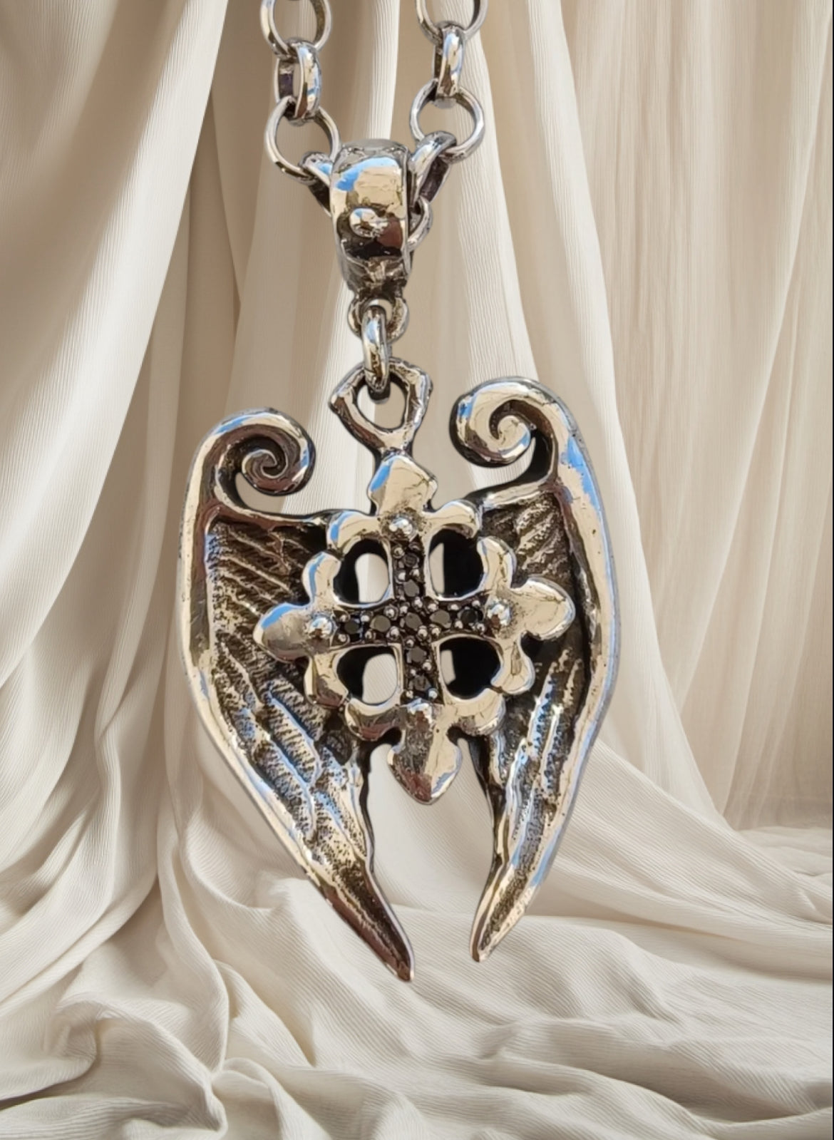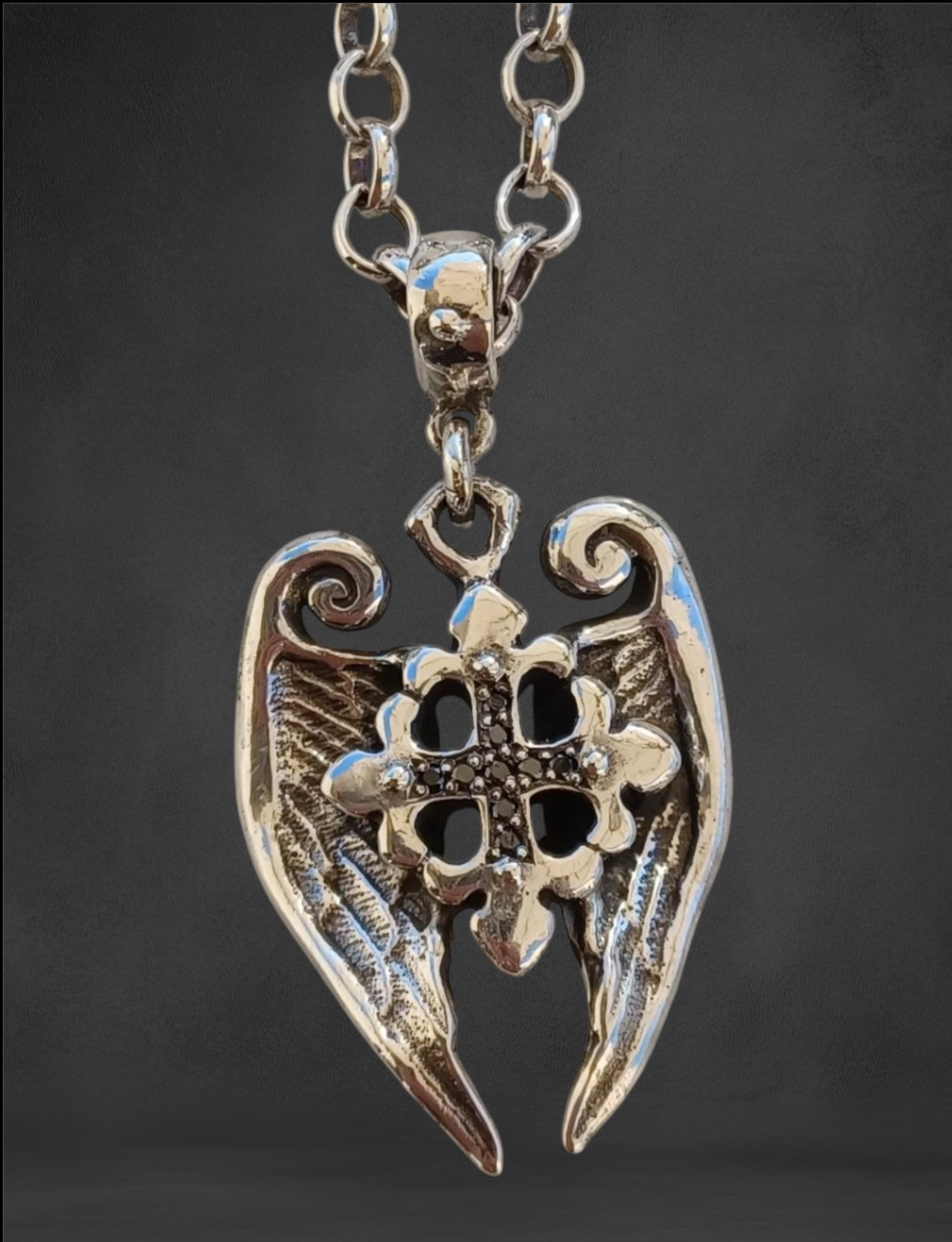 New 41% off code: 1C7TTP7MR8Q7 Sterling silver angel wings with flour de lis cross set with 9 black diamonds.