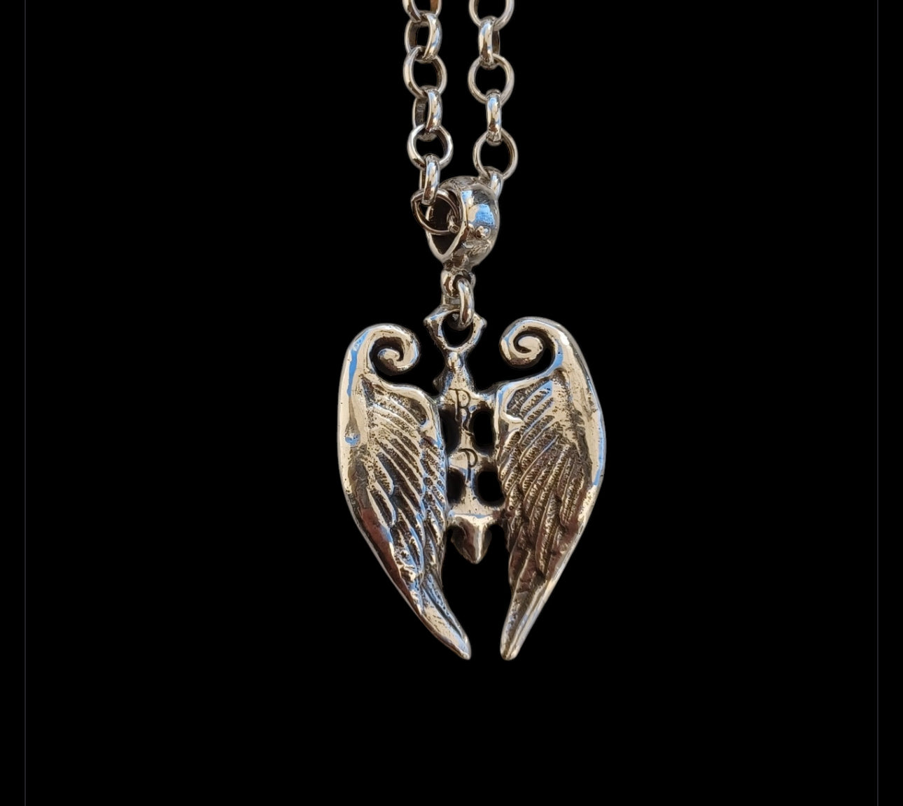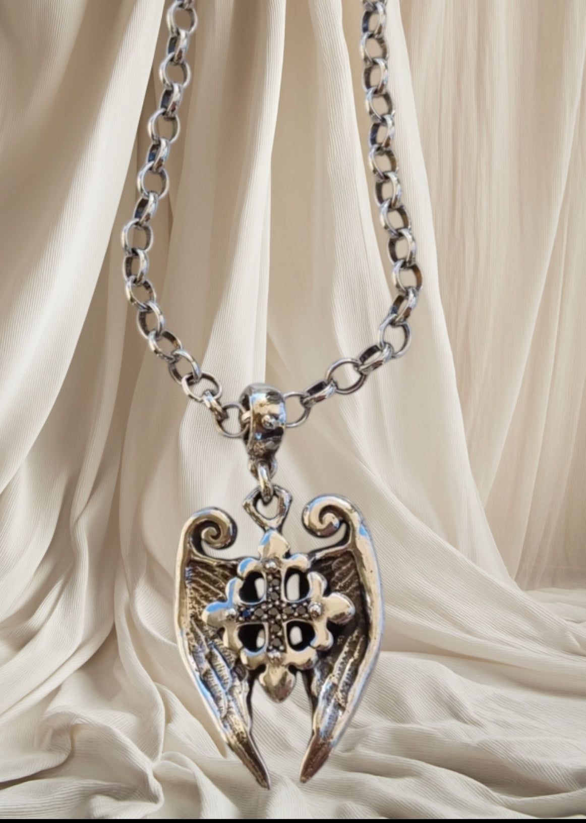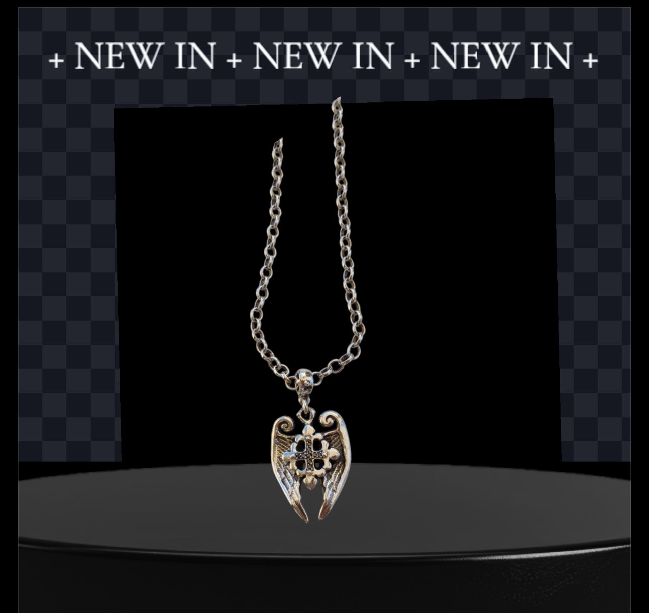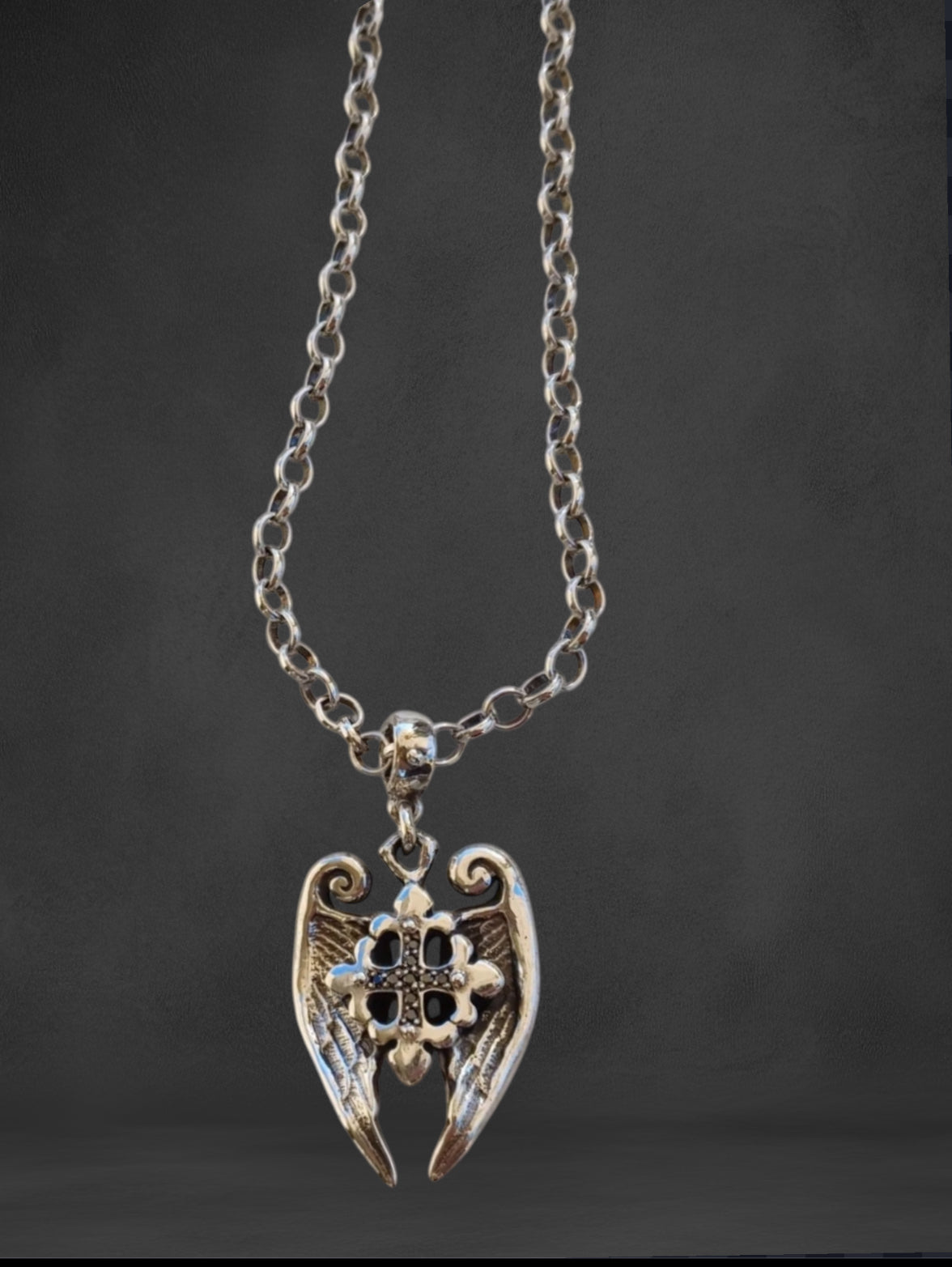 New 41% off code: 1C7TTP7MR8Q7 Sterling silver angel wings with flour de lis cross set with 9 black diamonds.