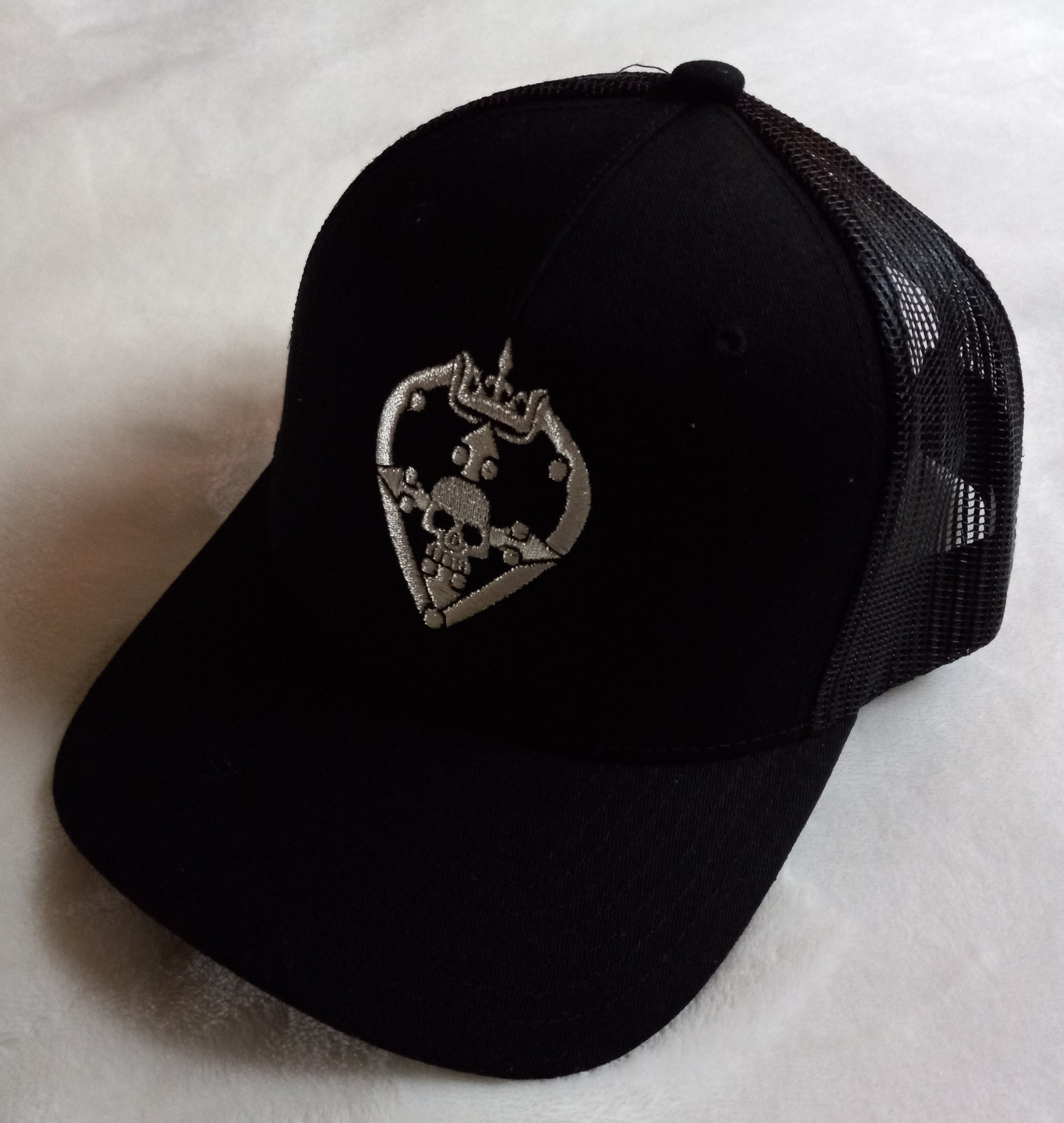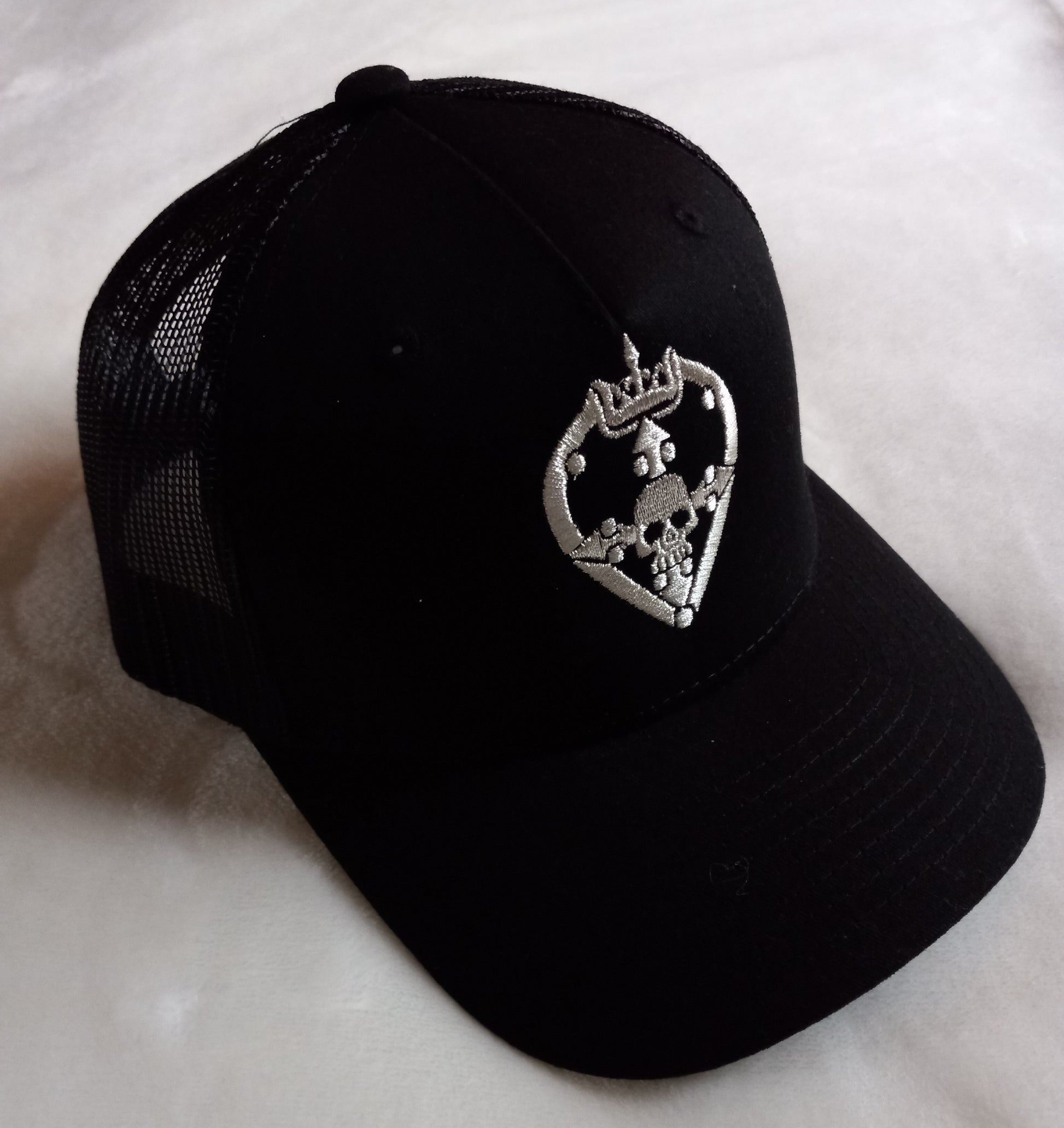 Black baseball cap hat with guitar pick and skull embroidery in white stitching. Kenny Chesney legendary necklace/pendant image.
