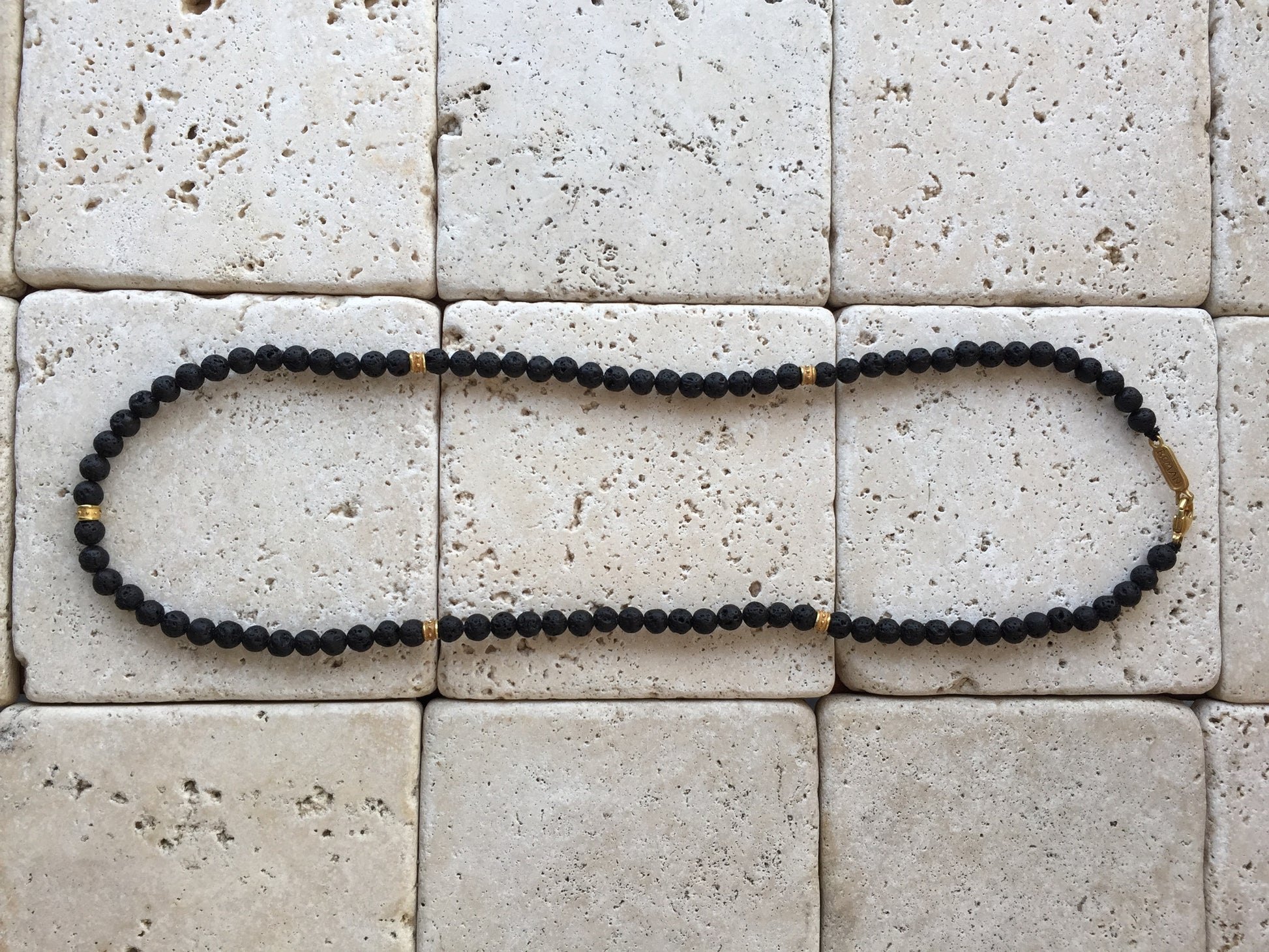 Lava beads 6mm with 18k gold plated bronze roundels- 24 inch long, lobster clasp.