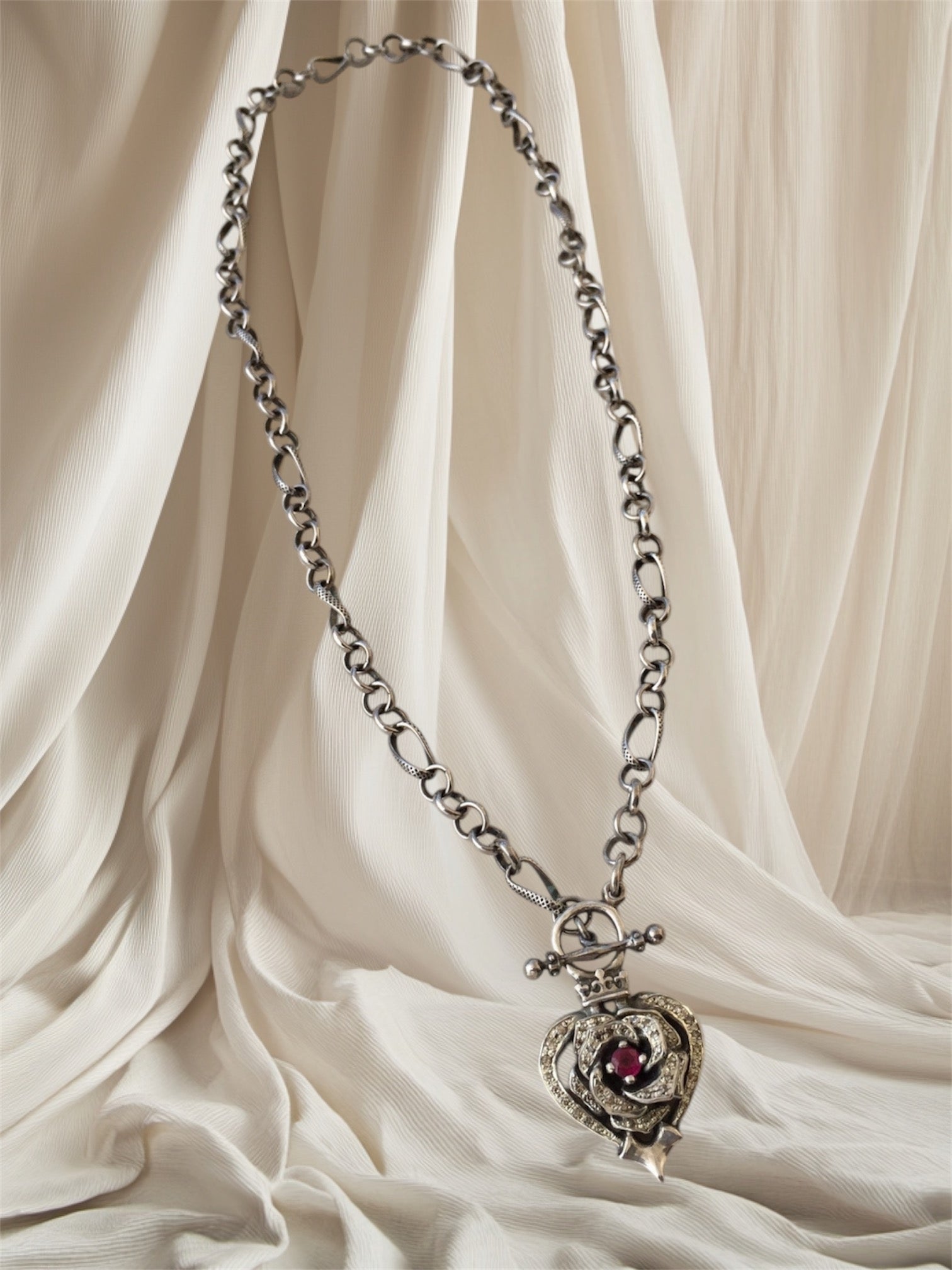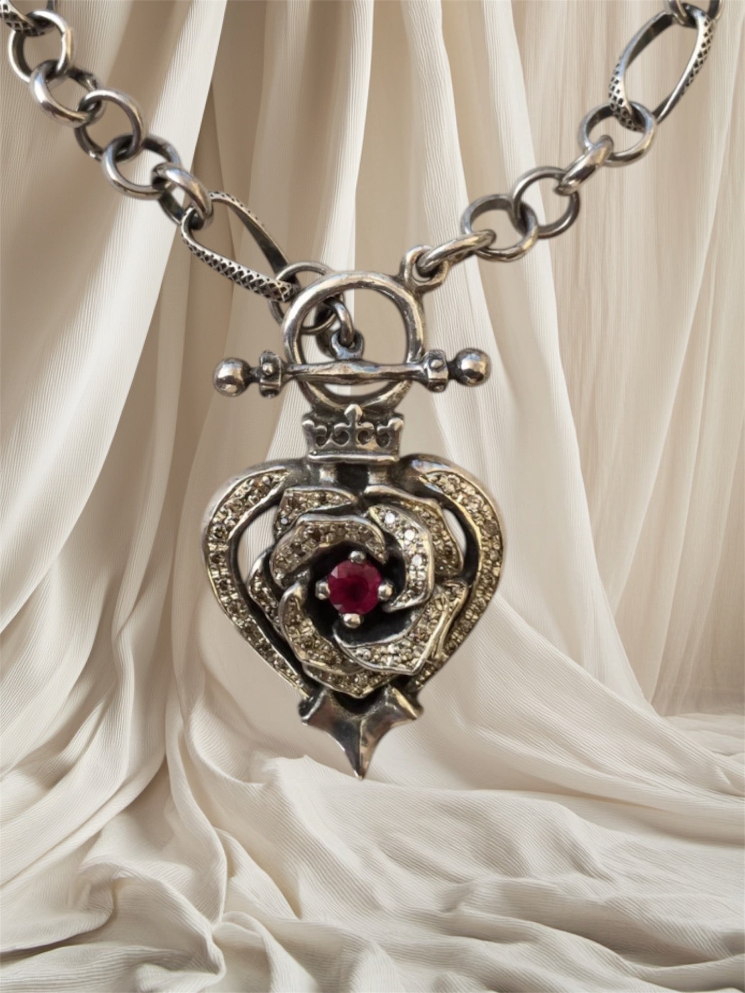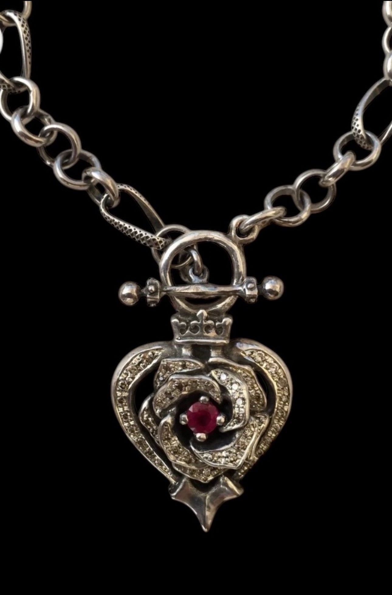 New 41% off code: 1C7TTP7MR8Q7 Sterling silver champagne diamond rose with red ruby center. T bar tagle loop closure. 18 inch ornament silver chain. Antique finish.