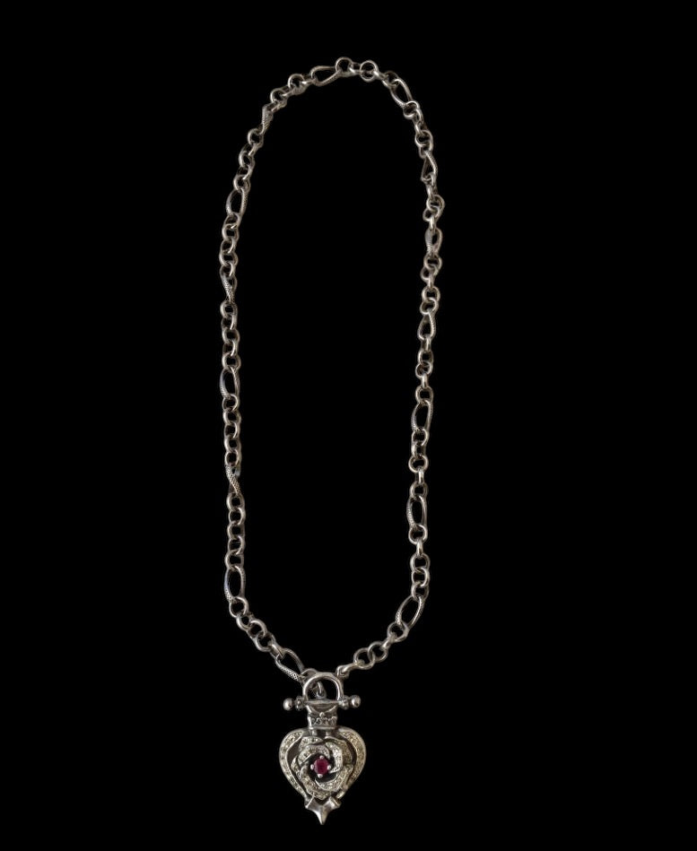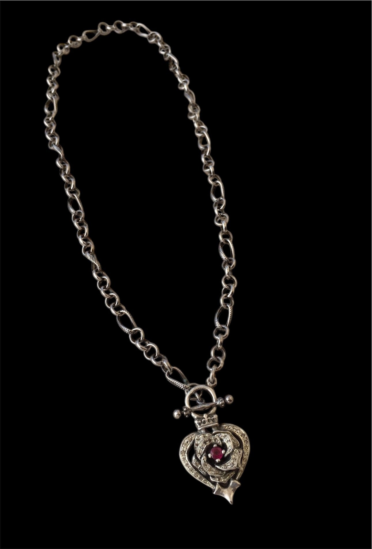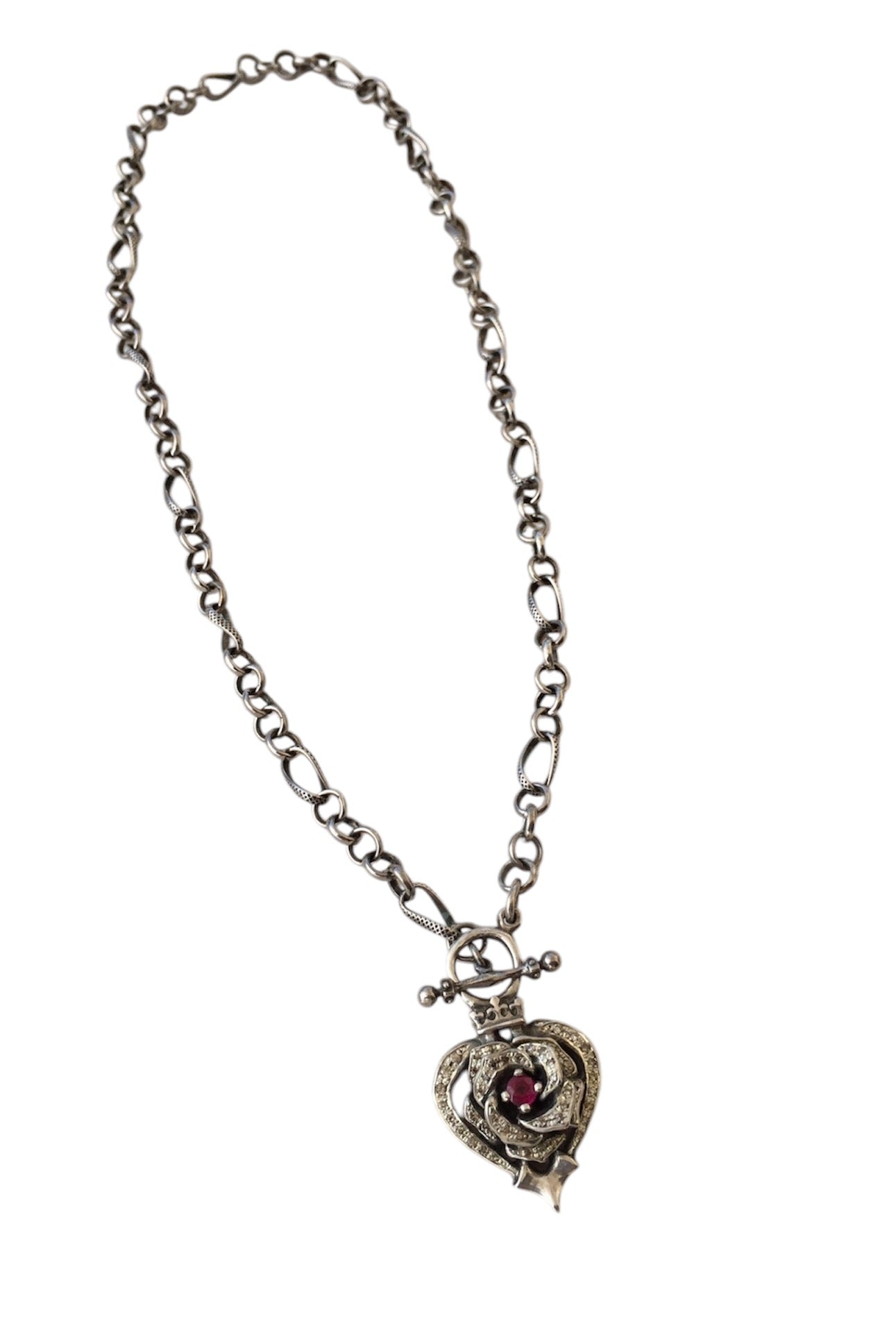 New 41% off code: 1C7TTP7MR8Q7 Sterling silver champagne diamond rose with red ruby center. T bar tagle loop closure. 18 inch ornament silver chain. Antique finish.