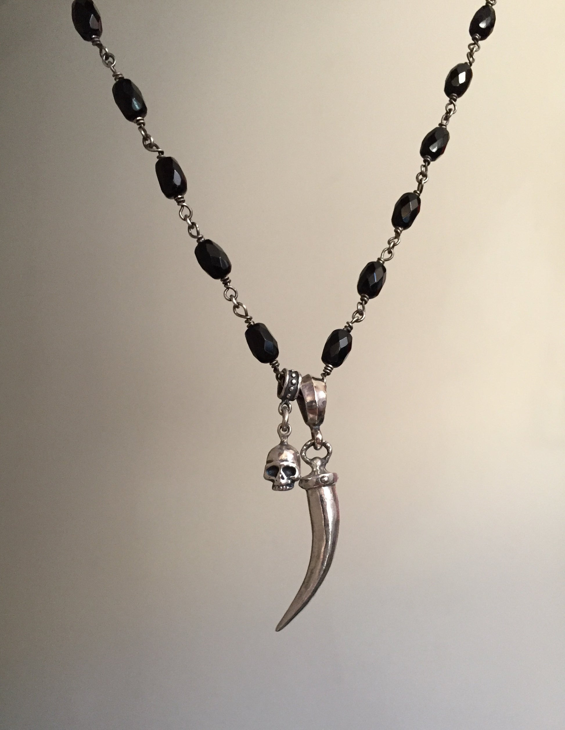 Sterling silver Italian horn with the skull. Faceted onyx beads with silver wire wrapping and lobster clasp. RED RUBIES SKULL EYES INCLUDED.