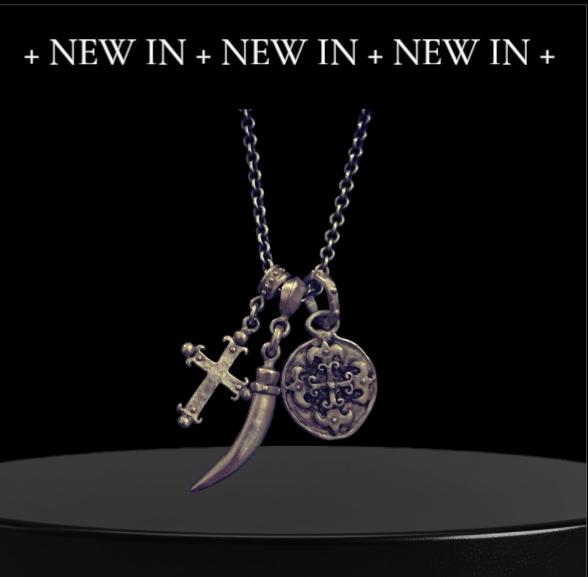 Sterling silver triple charm necklace with Italian horn for good luck.