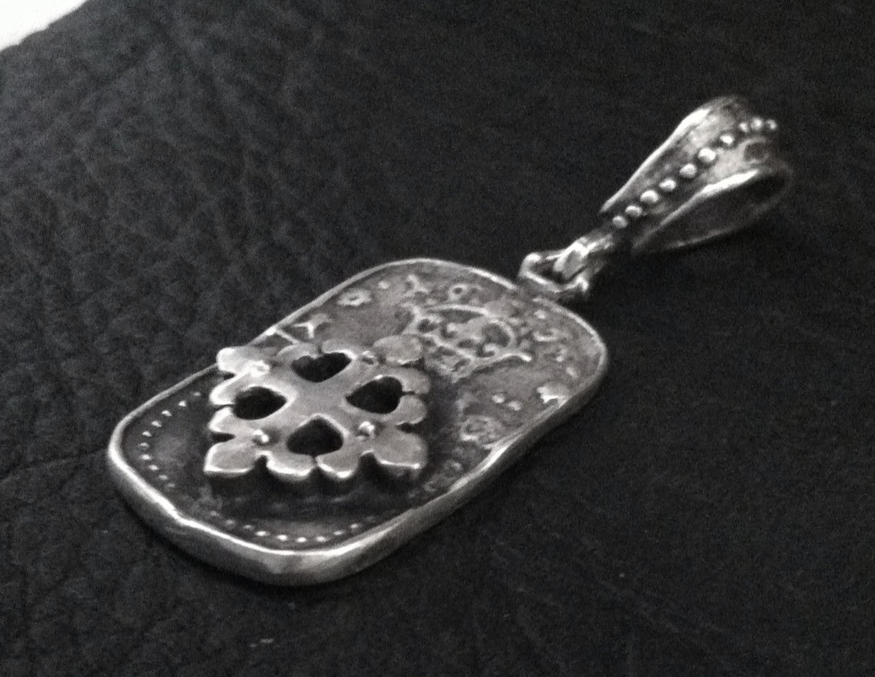 Sterling silver dog tag cross pendent. Renaissance style. Pendant with bail measures approx. 2 inch long and 3/4 of an inch wide. P 1290