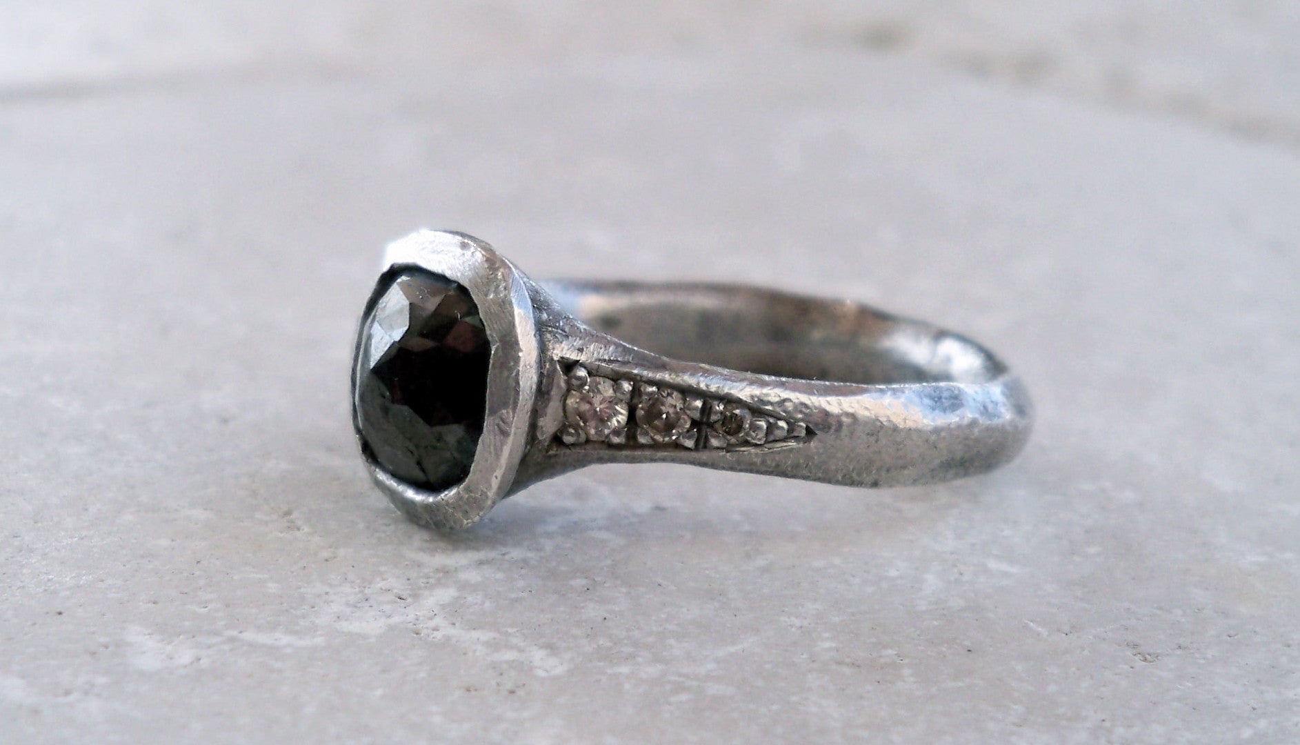 Sterling silver black diamond rind set with 8 champagne diamonds and 7x7mm rose cut black diamond approx. 1-14 ct. Rhodium finish . R CABdiam