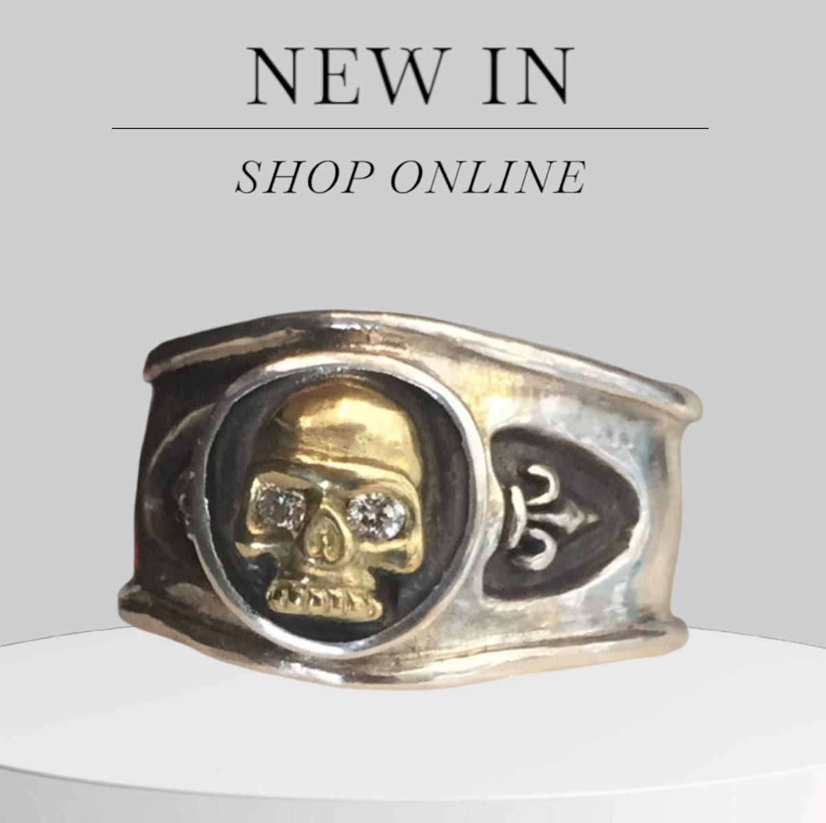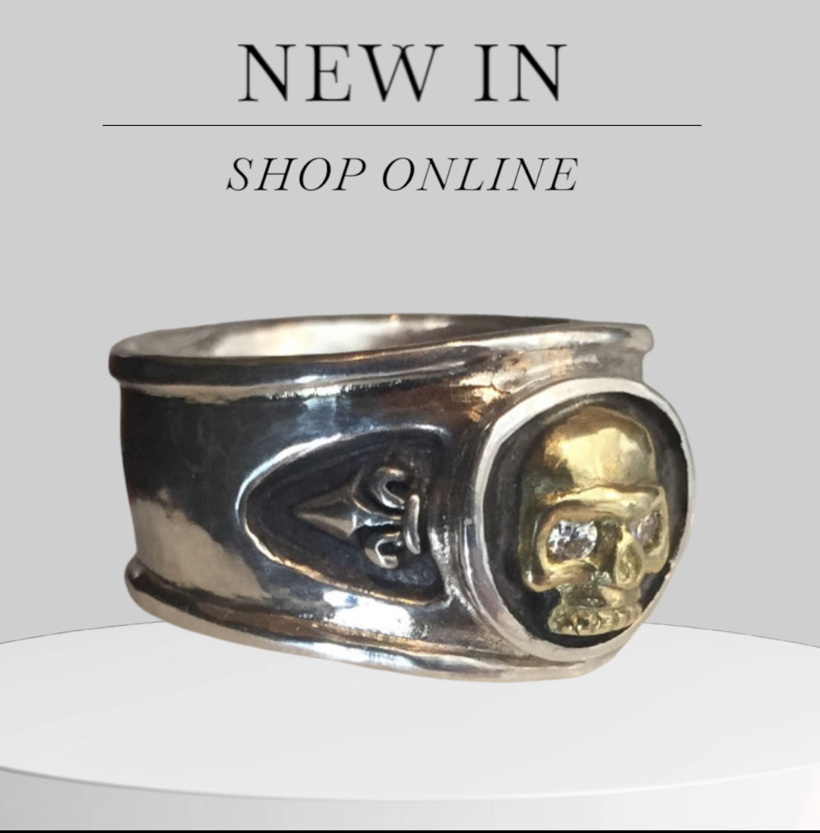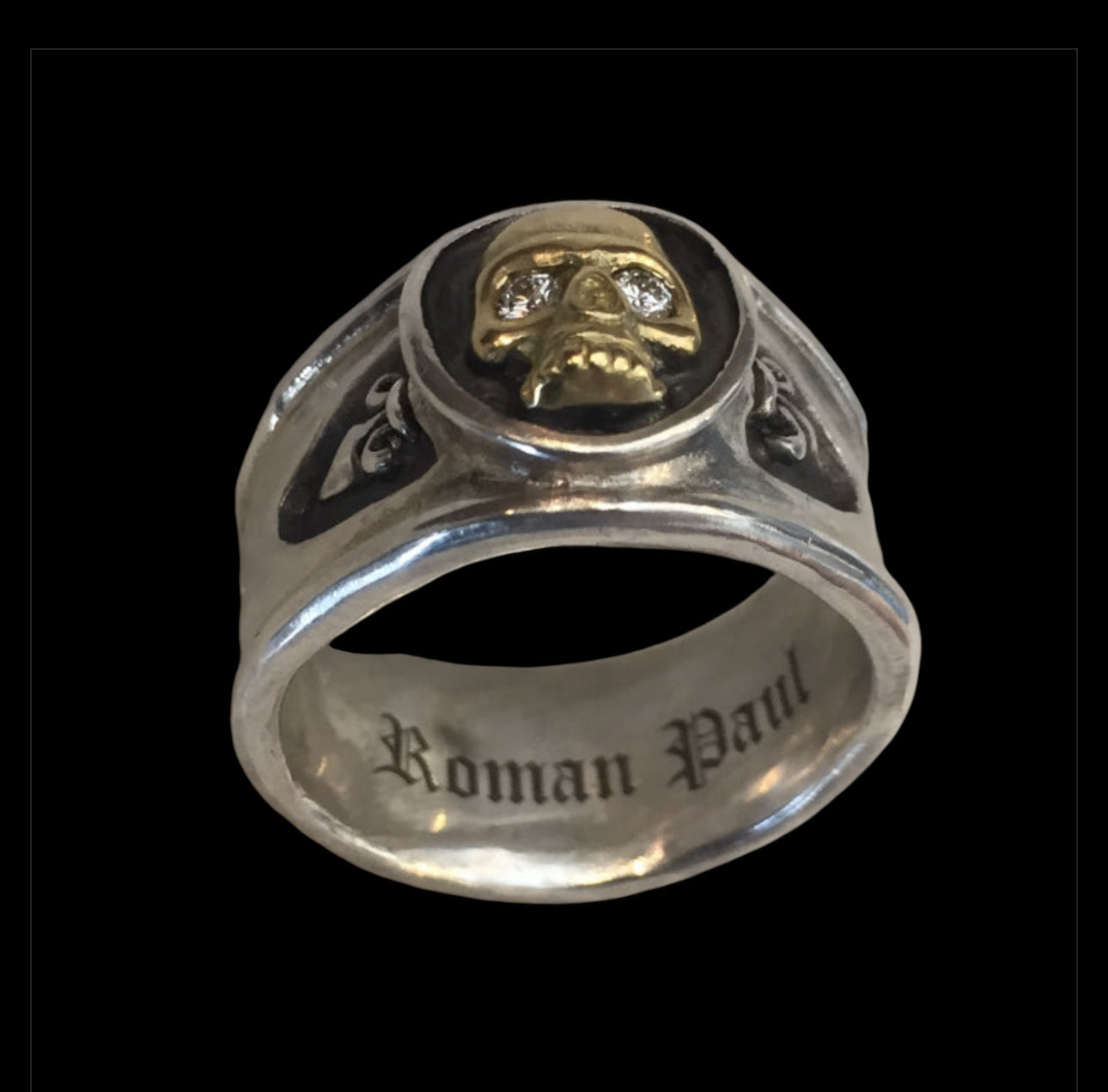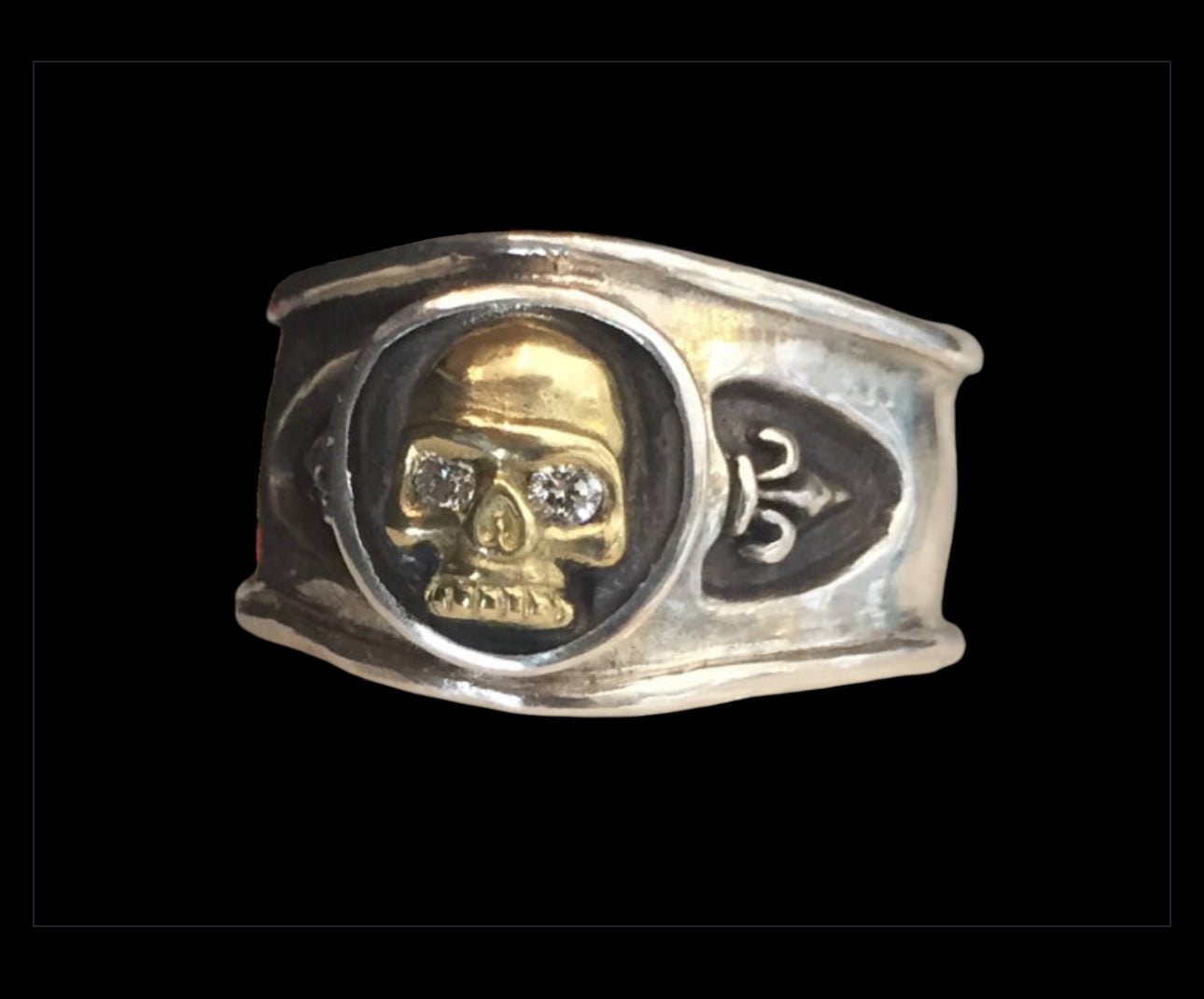 18k gold skull center set with white diamonds. Sterling silver ring. Oxidized hand curved finish.