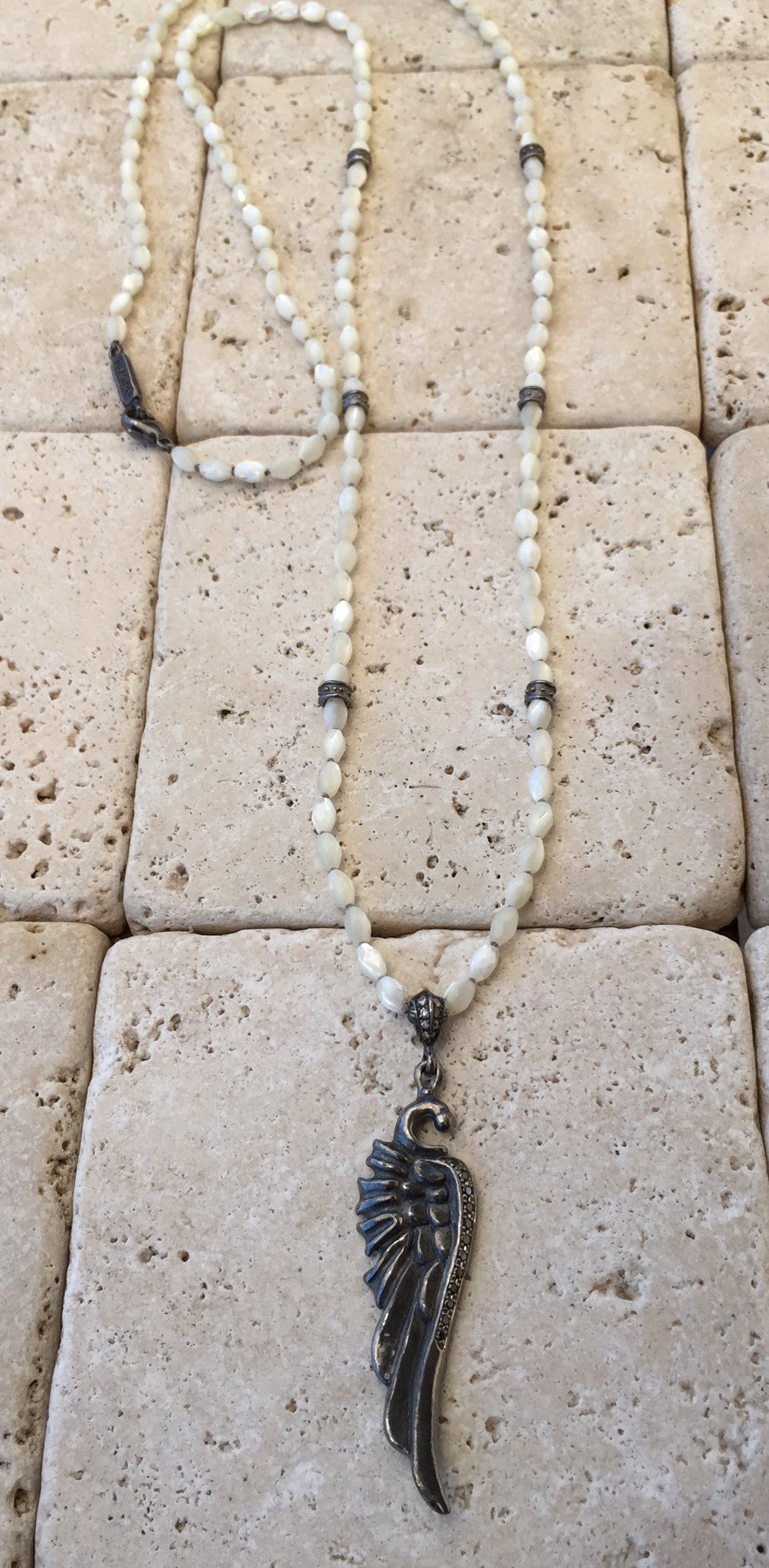 Sterling silver swan wing set with black and champagne diamonds. Mother of pearl faceted oval beads with sterling silver roundels. All is black platinum finished. Necklace is 35" inch long. N 1285-479 ss/Dia/Mth.
