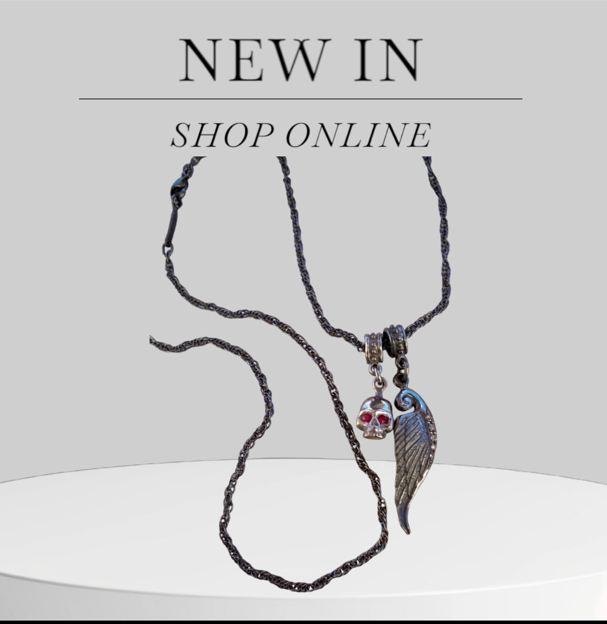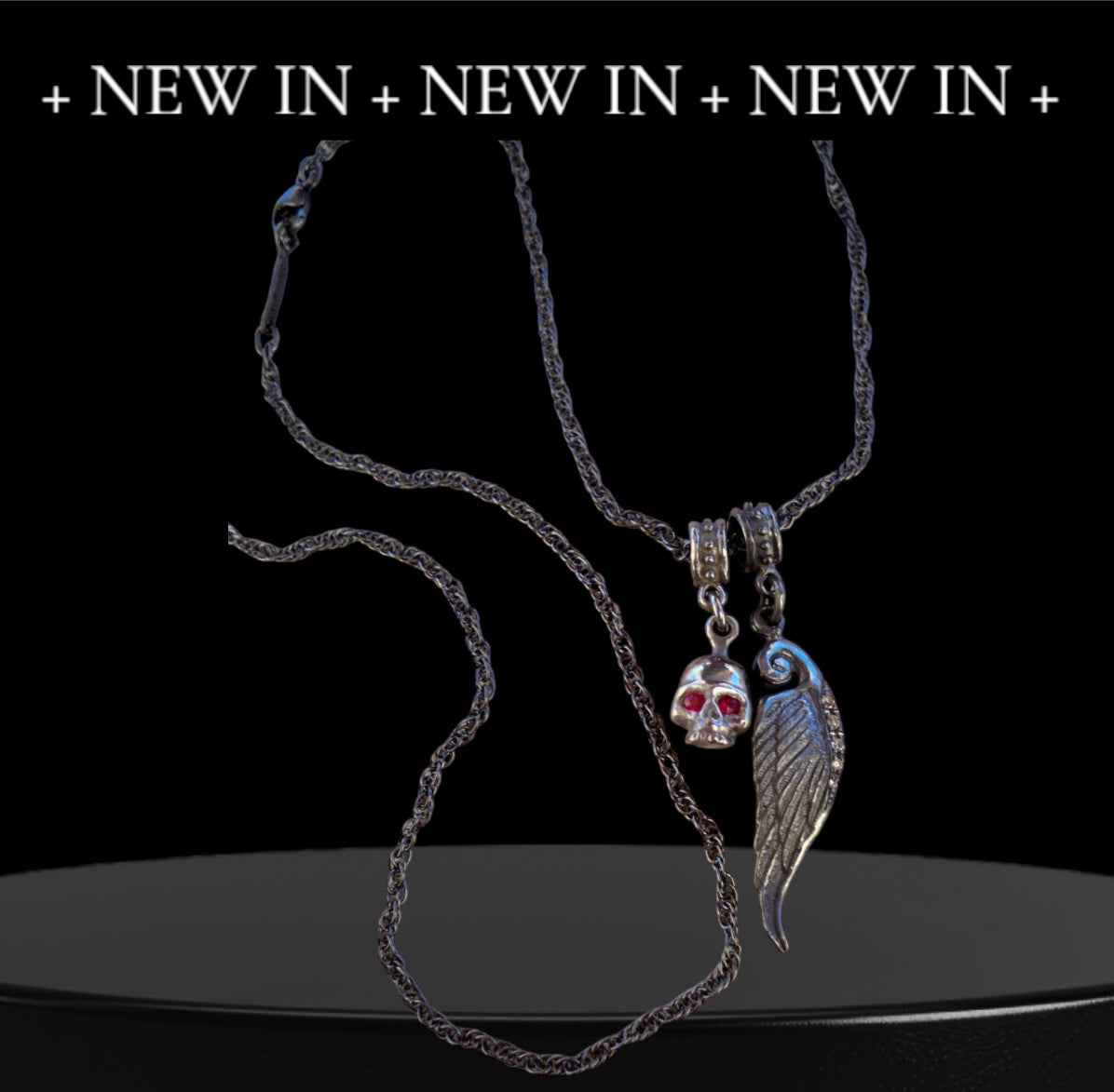 Sterling silver wing set with champagne diamonds and skull set with rubies on sterling silver chain. All black rhodium(black platinum) plated. N 1077 ss/dia.