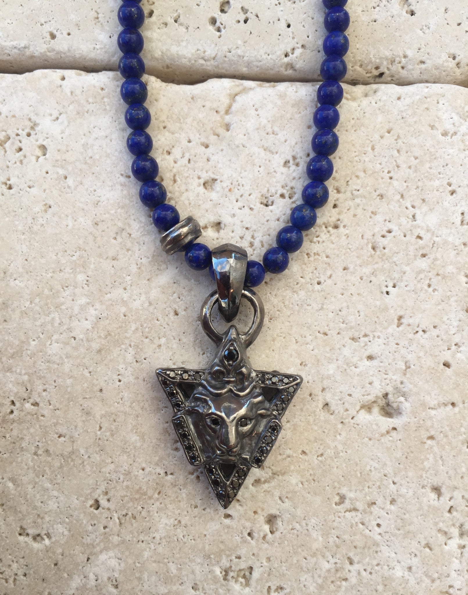Sterling silver emblem with lion head set with black diamonds. Black platinum finish. 22" inch long LAPIS beaded chain 4mm. N 1297 ss/Dia/la