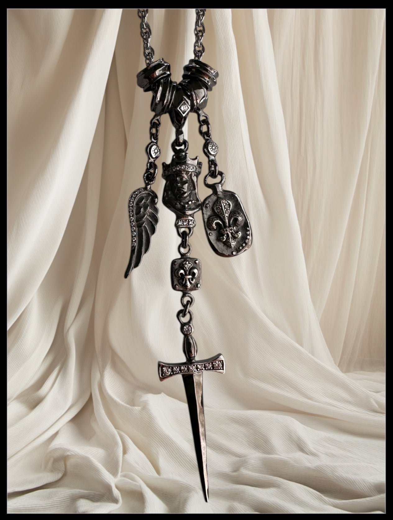 Sterling silver triple charm with king, sword, wing and Fleur de lis. White diamond pave. Black and white platinum plated. Starting silver woven chain with lobster clasp closure .