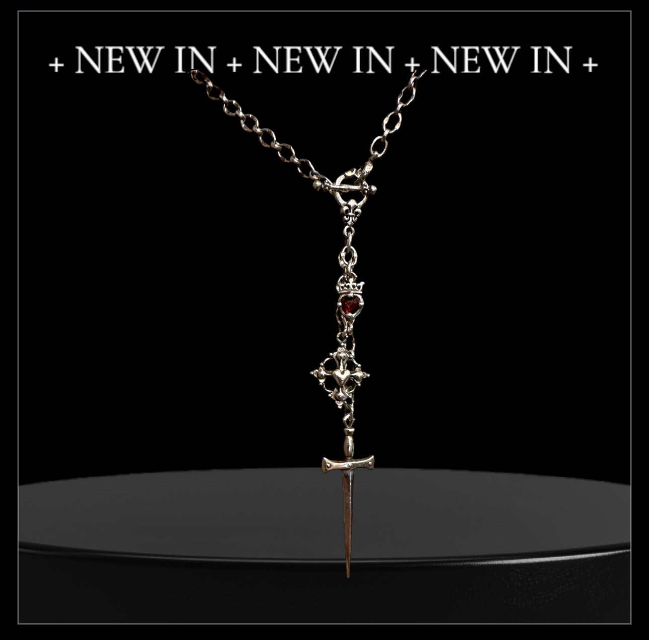 Heart shape garnet with crown, ornament cross heart center and sword.